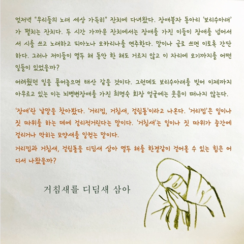 거침새를 디딤새 삼아 작성자기연택주|작성시간19.05.03|조회수61 목록 댓글 0 글자크기 작게가 글자크기 크게가 거침새를 디딤새 삼아...#보리수아래 #장애 다음검색 현재 게시글 추가 기능 열기 북마크 공유하기 신고 센터로 신고 댓글 댓글 0 댓글쓰기 답글쓰기 댓글 리스트