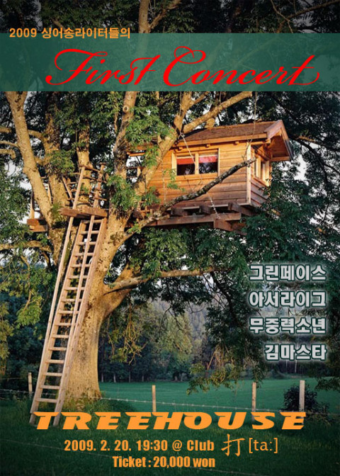 2009 첫번째 트리하우스 콘서트 소개글 일시 . 2009년 2월 20일 오후 7시 반 장소 . 홍대 클럽 타 게스트 . 그린페이스/아서라이그/무중력소년/김마스타 십여명의 싱어송라이터들의 모임인 트리하우스(나무위의 집)에서 만들어낸 올해 첫 이야기 콘서트. 클럽 타에서 올해 매달 셋번째주 금요일에 이들의 음악과 살아가는 이야기들을 만날 수 있습니다. 곡을 만들고 부르는 사람들은 어찌보면 보통 사람들과는 다른 생활을 할것 같지만 그이들도 같은 세상에서 같은 길을 걷고 있습니다. 위로 받기 좋아하고 위로 하기 좋아하는 그들과 가볍지만 흐트러지지 않은 이야기와 노래로 만나보고 싶지 않습니까? 혼자도 좋고 누군가의 손을 잡고 오는 것도 좋을 것입니다. 하루만큼은 다른 자리에 앉아 보는 것. 좋은 세상경험이 될꺼 같습니다. 초대합니다, 당신을. 추신. 부활의 보컬이었던 정단이 새롭게 꾸며내는 음악여행 <그린페이스>의 '사랑한다'에 빠져보시고 이웃집 총각의 아스라한 속사정을 오붓한 상에서 둘러앉아 들어보는 아서라이그의 음악과 인간문화재 대목의 손자로 자라서 잘손질된 그리고 딱맞춘 사람과 사람사이를 노래하는 무중력소년에 이 모든 게스트들과 당신을 비오는 날 처마에 앉아서 차한잔 앞에 두고 기다리는 김마스타가 함께 합니다. |