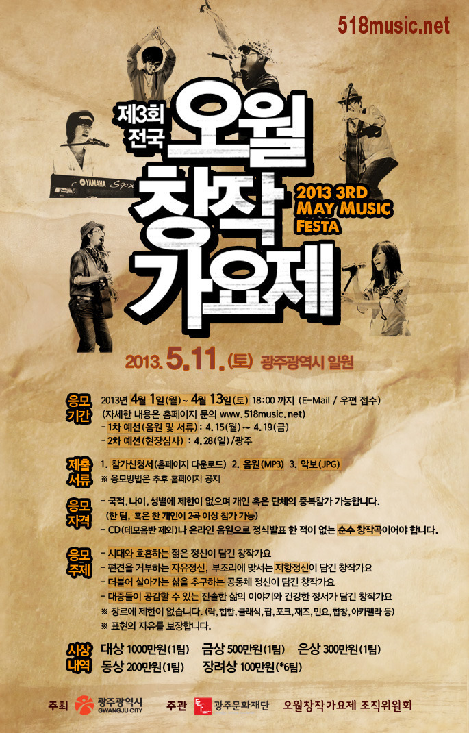 제3회 오월창작가요제를 개최합니다. 작성자오월창작가요제|작성시간13.02.19|조회수15 목록 댓글 0 글자크기 작게가 글자크기 크게가 안녕하세요! 오월창작가요제 조직위원회입니다. 올해 2013년 제3회 오월창작가요제를 개최합니다. 많은 관심 부탁드립니다. www.maymusicfesta.net 다음검색 현재 게시글 추가 기능 열기 북마크 공유하기 신고 센터로 신고 댓글 댓글 0 댓글쓰기 답글쓰기 댓글 리스트
