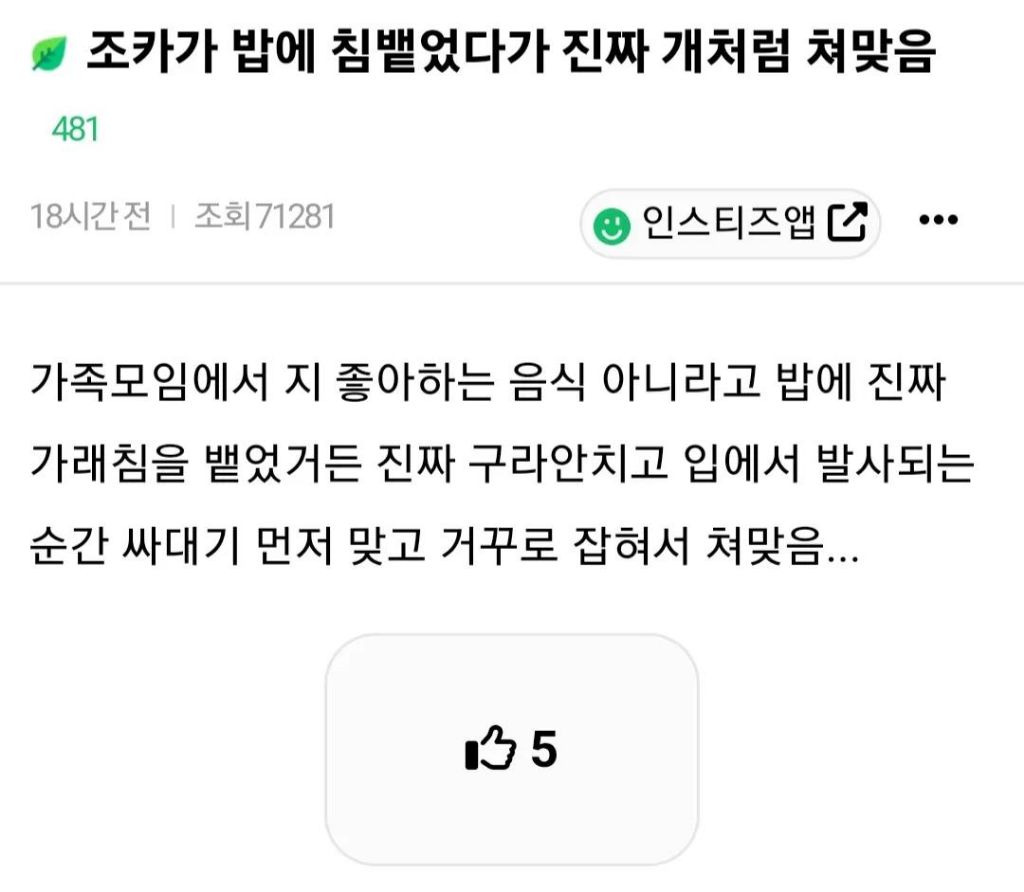 작성자남자라면남성시대 작성시간 25.12.31 문제는 아버지가 때렸으면 다행인데 다른 분이 때렸으면