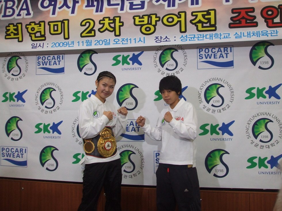 | * WBA 여자 페더급 세계 타이틀 매치 - 일시 : 2009년 11월 21(토요일) - 장소 : 성균관 대학교 체육관(수원) - 주최 : 호미 엔터테인먼트 [경기대진표] (10R) 최현미 vs 츠바사 탱고(일본) <57.150Kg> <WBA 여자 페더급 세계 타이틀 매치> (8R) 이종화(프라임) vs 박찬희(진주최기수) <52.160Kg> (6R) 김한철(부산장정구) vs 정광해(삼성) <74.000Kg> (4R) 최재광(빅스타) vs 임성식(프라임) <55.000Kg> (4R) 길인수(중화) vs 홍기태(춘천아트) <51.000Kg> (4R) 배진호(동부은성) vs 김한석(중산) <64.000Kg> (4R) 윤이진(리빙) vs 김의선(록키) <70.000Kg> (4R) 정진기(일산주엽) vs 최충봉(평택월드) <51.500Kg> #왼쪽이 홍코너, 오른쪽이 청코너입니다. #계체량 및 의무검진은 추후에 공지하겠습니다. |