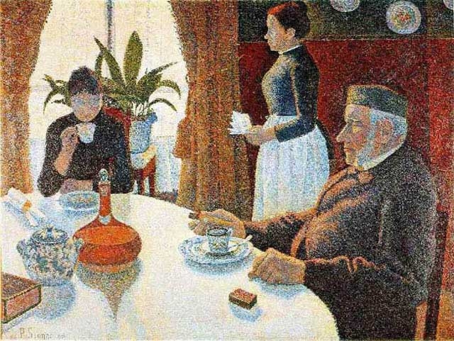 부르조아 가정의 식사 모습을 사실적으로 묘사했다. 식사를 다루는 주제는 역시 평범하지만 작은 점묘가 아주 치밀하게 적용된 것을 볼 수 있다. 쇠라 보다 광선에 의한 효과의 고려가 상당히 두드러 지는데, 마치 인상파 작품처럼 빛의 느낌을 잘 받을 수 있는 화면이다. 점은 아주 작고 화면의 밝고 어두운 면의 차이를 미미하지만 섬세하게 표현한다.