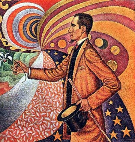 마치 설명서의 한 문장처럼 긴 제목의 이 작품은 당시 미술 비평가이자 친구였던 페네온의 초상을 점묘로 표현했다. 원색의 배경은 마치 색환을 진열한 것 같은 현란한 모습이고 돌아가는 형광 간판과 같은 바람개비 문양이 놀이 동산에 서 있는 조악한 기구 같기도 하다.