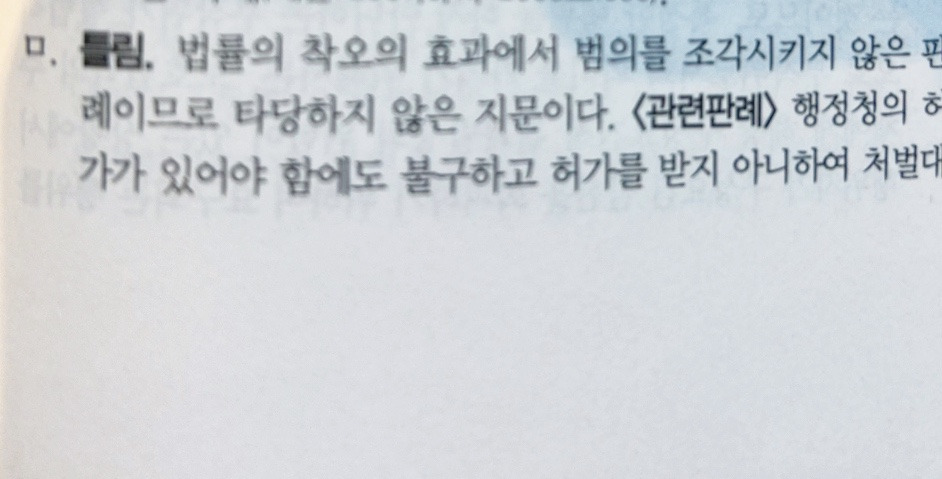 Law Man 경찰형사법 전범위 동형모고 문의 작성자경찰간부|작성시간25.02.17|조회수69 목록 댓글 1 글자크기 작게가 글자크기 크게가 안녕하세요 교수님 출간해주신 동형모고 잘 풀고 있습니다. 5회 7번 ㅁ 지문에서 허가를 받지 않는것에 대해 정당한 이유가 있으므로 범의를 조각하는 경우가 아닌지 궁금해서 문의드립니다. 다음검색 현재 게시글 추가 기능 열기 북마크 공유하기 신고 센터로 신고 댓글 댓글 1 댓글쓰기 답글쓰기 댓글 리스트 작성자中正 | 작성시간 25.02.18 제가 오후 강의가 있어 답변이 늦었습니다. 별도의 답글로 답변을 드렸으니 참고하시기 바랍니다. 댓글 전체보기