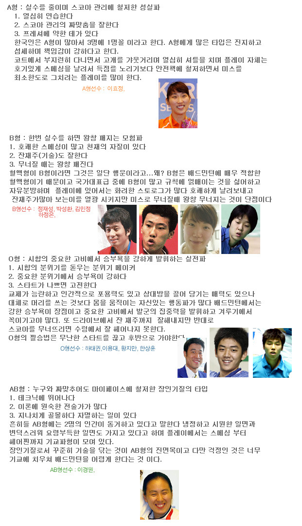 [펌] 혈액형 별로 보는 배드민턴 스~~타일! 작성자마르스(임종걸)|작성시간09.09.25|조회수117 목록 댓글 1 글자크기 작게가 글자크기 크게가 안산배드민턴클럽 | 김영숙 http://cafe.naver.com/ansanbc/994 난 B형 ㅡ.ㅡ;; 천재성..ㅋㅋ 배드민턴에 적합한 혈액형....푸힛.. 다음검색 현재 게시글 추가 기능 열기 북마크 공유하기 신고 센터로 신고 댓글 댓글 1 댓글쓰기 답글쓰기 댓글 리스트 작성자장희얍 | 작성시간 09.10.08 너 천재냐? 댓글 전체보기