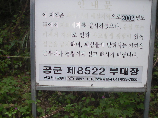 들어갈수는 없다 그러나 은하봉(224m)으로 가기위해서는 부대 오른편 철조망을 끼고 돌아가야 하는데 경고 안내문을