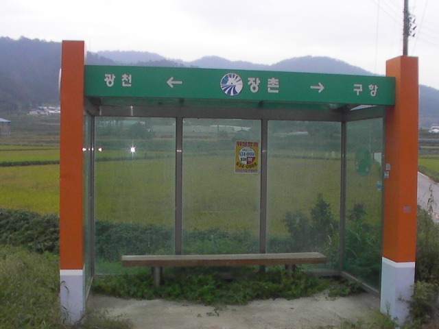 (장말에서 500 여m를 더 내려간 사거리 도로변에 있는 장촌 버스정류장 10:35분)