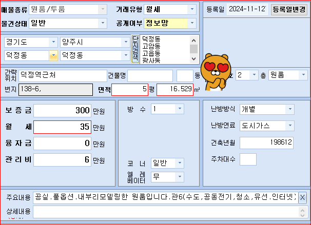 양주 덕정동 덕정역도보가능한 원룸 월세 300/35, 관리비 6만원, 월세조정여지있음.풀옵션 작성자양주 덕정부동산 부동산에버랜드|작성시간24.11.12|조회수21 목록 댓글 0 글자크기 작게가 글자크기 크게가 양주 덕정동 138-6 양주 덕정동 164-4,103호덕정부동산 이현화가3620-1375031-864-8877010-4125-2647 다음검색 현재 게시글 추가 기능 열기 북마크 공유하기 신고 센터로 신고 댓글 댓글 0 댓글쓰기 답글쓰기 댓글 리스트