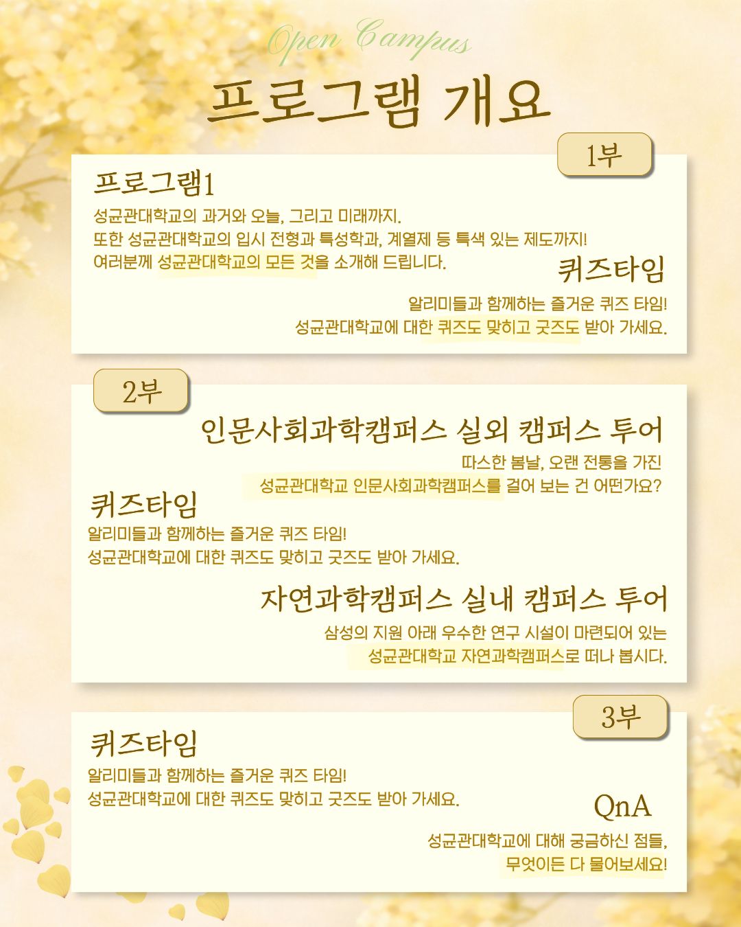 성균관대학교 입시 관련 설명과 학교 소개, 캠퍼스 투어 프로그램 등이 함께 진행될 예정입니다.