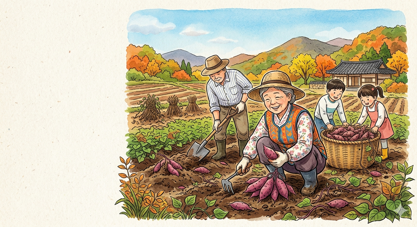 시대의 변화: 8월에 고구마를 캐는 것은 조생종(일찍 수확하는 품종)이 보급된 현대 농업의 모습입니다. 전통적인 농사법을 고수하는 아버지와 변화하는 시장 환경에 민감한 아들의 모습은 오늘날 우리 사회의 세대 차이를 상징적으로 나타냅니다.