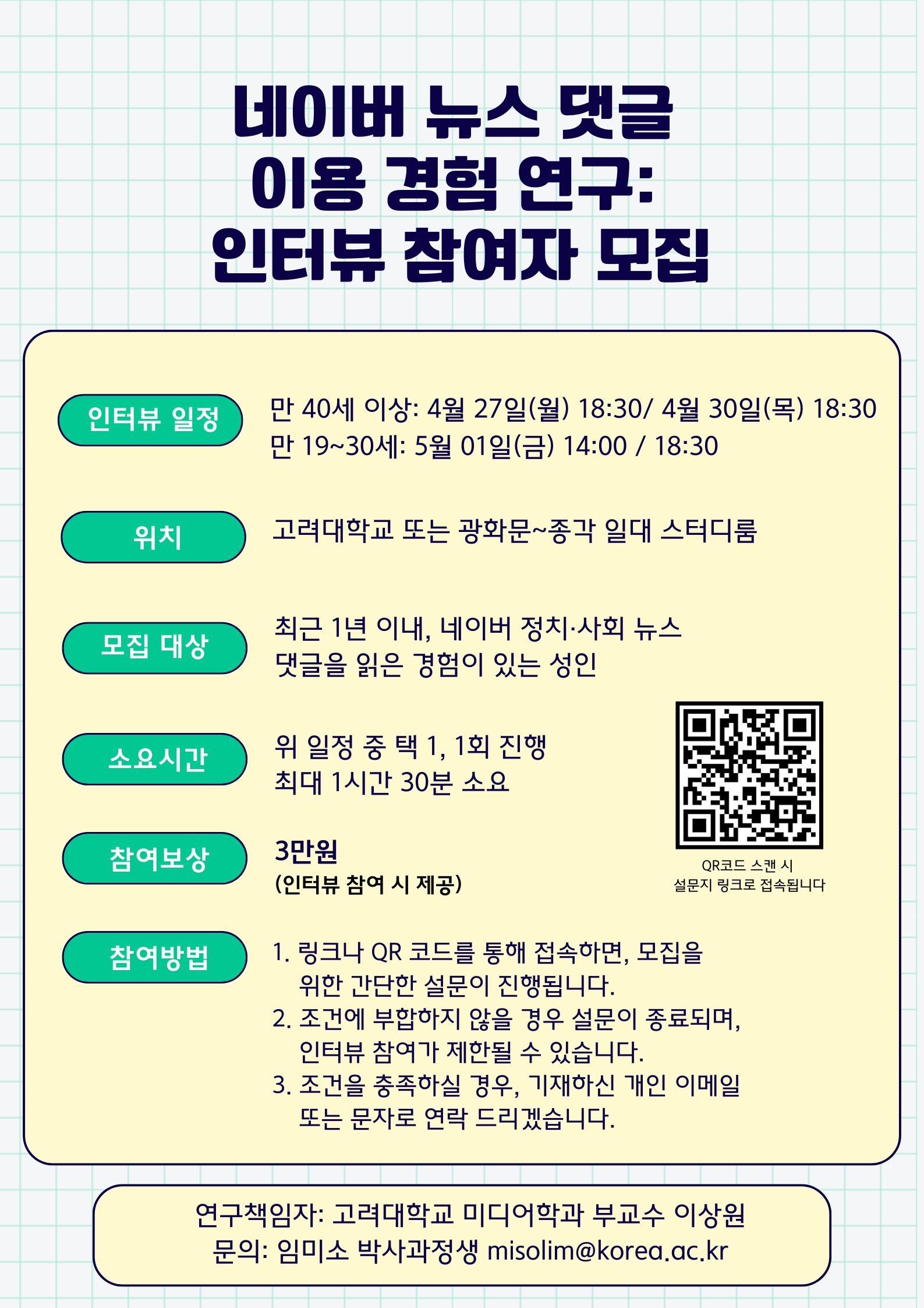 여러분들께서 네이버 정치사회 분야 뉴스 댓글들에 대해 어떤 생각을 가지고 계신지 여쭙는 인터뷰 참여자를 모집 중에 있습니다.
