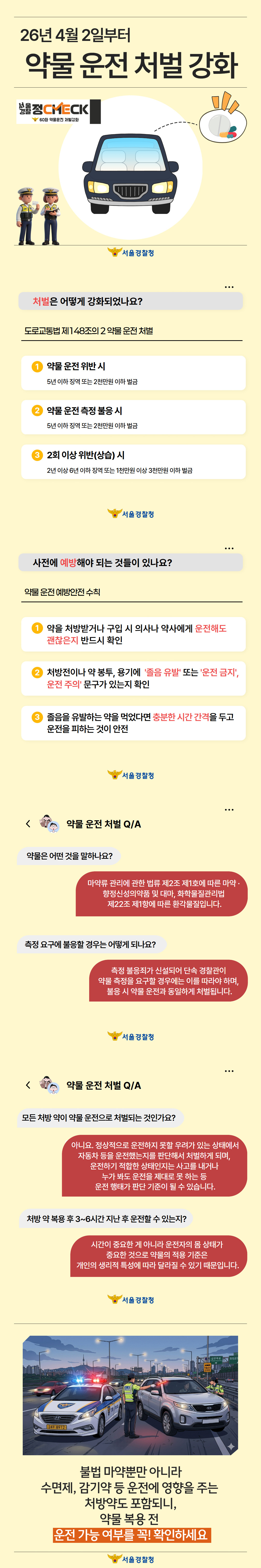 26년4월2일부터 시행되는 약물운전 처벌강화 한번 알아볼까요? 작성자강남경찰서홍보|작성시간07:26|조회수22 목록 댓글 0 글자크기 작게가 글자크기 크게가 다음검색 현재 게시글 추가 기능 열기 북마크 공유하기 신고 센터로 신고 댓글 댓글 0 댓글쓰기 답글쓰기 댓글 리스트