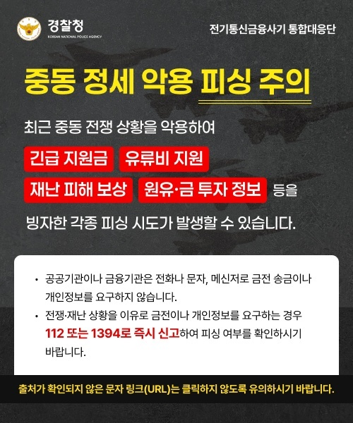 [강남경찰서] 중동정세악용 보이스 주의!! 작성자강남경찰서홍보|작성시간26.04.09|조회수51 목록 댓글 0 글자크기 작게가 글자크기 크게가 다음검색 현재 게시글 추가 기능 열기 북마크 공유하기 신고 센터로 신고 댓글 댓글 0 댓글쓰기 답글쓰기 댓글 리스트