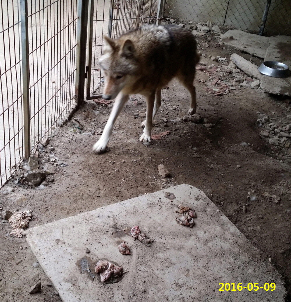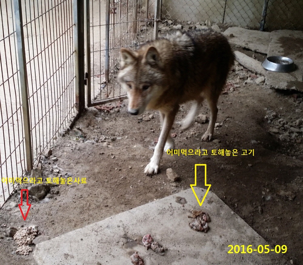 ㅇ 고기와 사료를 부드럽게 씹어 소화를 시킨후 어미늑대 먹으라고 집앞에 "토해놓은 대장늑대"