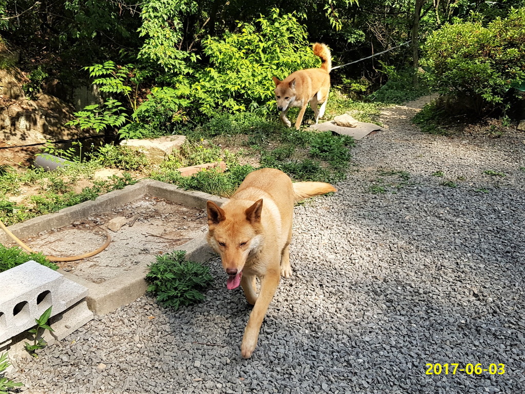 "용이"(F1 ♂)는 우리집 명견 진순이(진도개 ♀) 와 첫째늑대 사이에서 태어난 자견