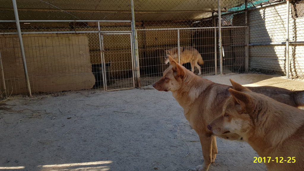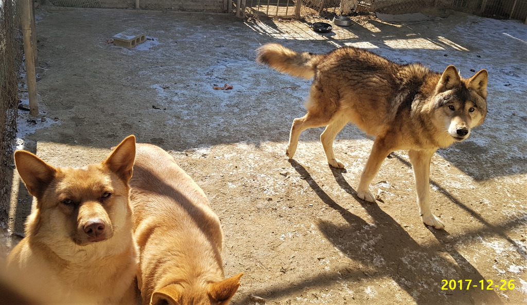 암컷 사망후 10일째, 홀로있는 "첫째"늑대를 철망으로 분리후 발정중인 울프독(F2)" "랑이"와"옥이"를 합사시키자 서로 관심을 갖고 적대시 하지않아 문을 개방, 합사시키자, 발정난 "랑이"와 "옥이"가 늑대(♂)를 보고 좋아 날뛰며 애교를 부려 첫째도 한가족으로 인정한것 같읍니다, 밤 11시 경에는 늑대와 "랑이"가 첫 교배를 하였 답니다