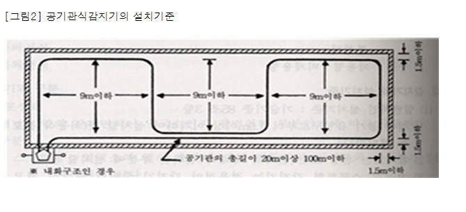 2)공기관과 감지구역의 각 변과의 수평거리는 1.5m 이하가 되도록하고, 공기관 상호간의 거리는 6m이하가 되도록 할 것.