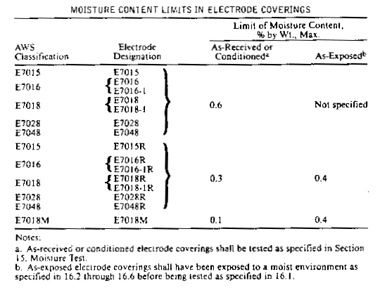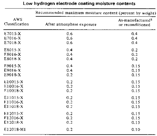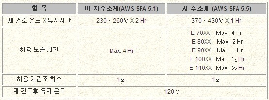 AWS에서 규제하는 저수소계 용접봉의 수분 함량은 종류에 따라 약간씩 다르지만 AWS SFA 5.1과 SFA 5.5의 경우 위의Table 1.기준에 따른다.