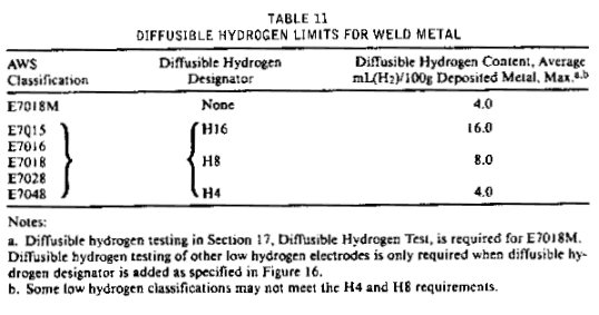 이렇게 용접봉 자체의 수분 함량을 제한하는 것 이외에 용접 금속에 존재하는 수소의 량을 측정하여 제한하기도 한다. E7018M이나 확산성 수소의 측정이 요구되는 경우에는 AWS A4.3에 따라 확산성 수소를 측정하며, 그 합부의 기준은 다음에 따른다.