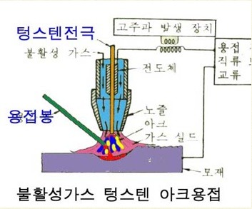 TIG 용접은 비소모성 텅스텐 용접봉과 모재간의 아크열에 의해 모재를 용접하는 방법으로서, 그림의 원리도와 같이 용접부 주위에 불활성가스를 공급하면서 용접하는 것입니다.