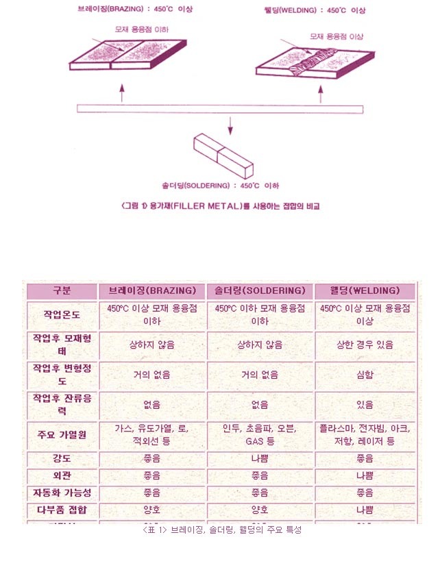 참고로 <표 1>은 브레이징, 솔더링, 웰딩의 주요 특성을 구분한 내용이다.