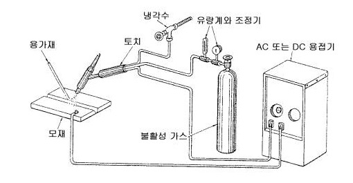 ▶ 텅스텐 봉을 전극으로 하는 토치(torch) 내에서 아르곤(argon) 또는 헬륨(helium)등 불활성(不活性)가스로