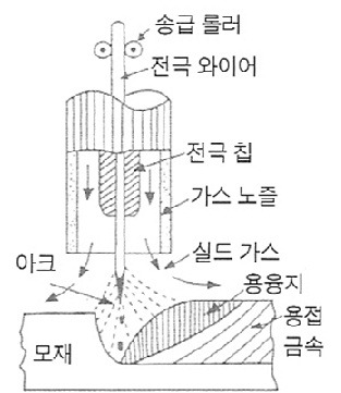 솔리드 와이어에서는 직류용접기에 CO², CO² + O², CO² + Ar 등의 가스가 사용되고,