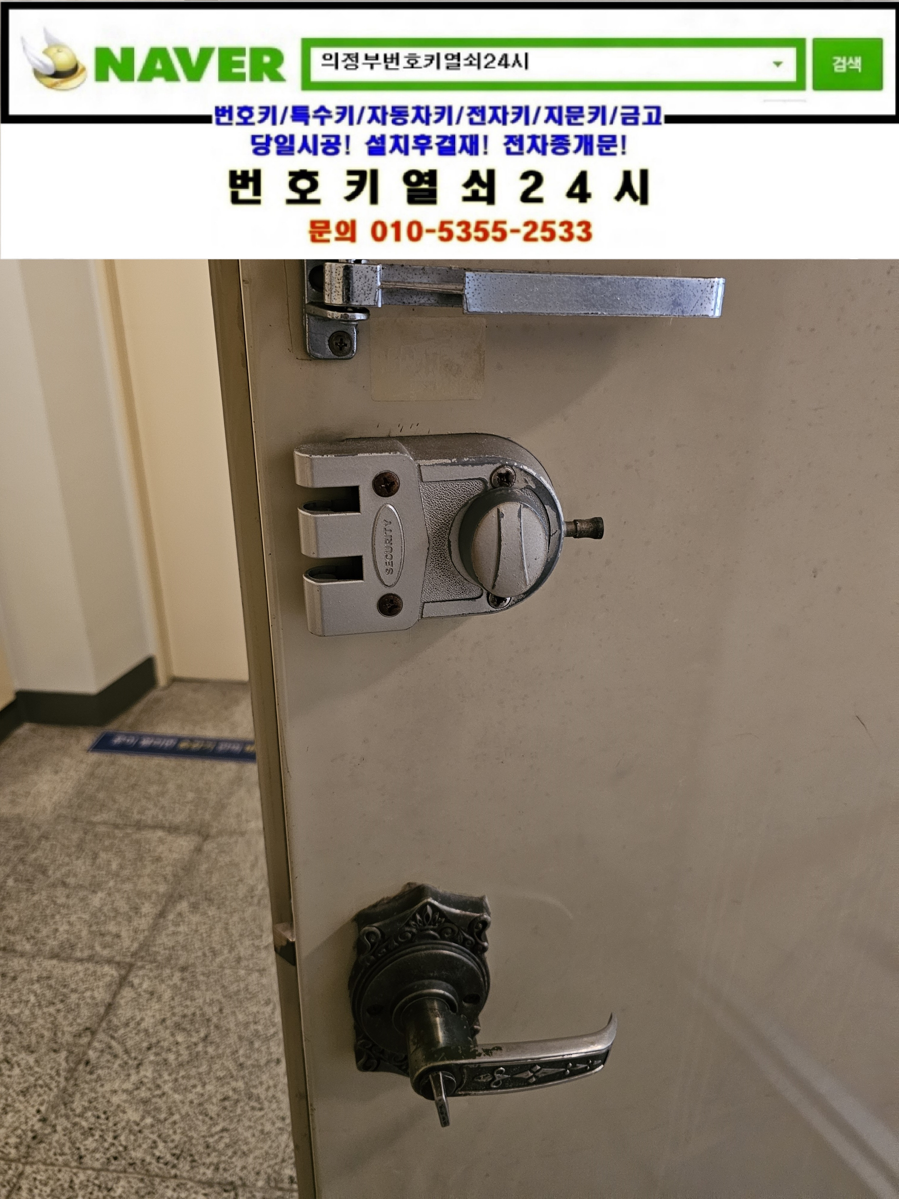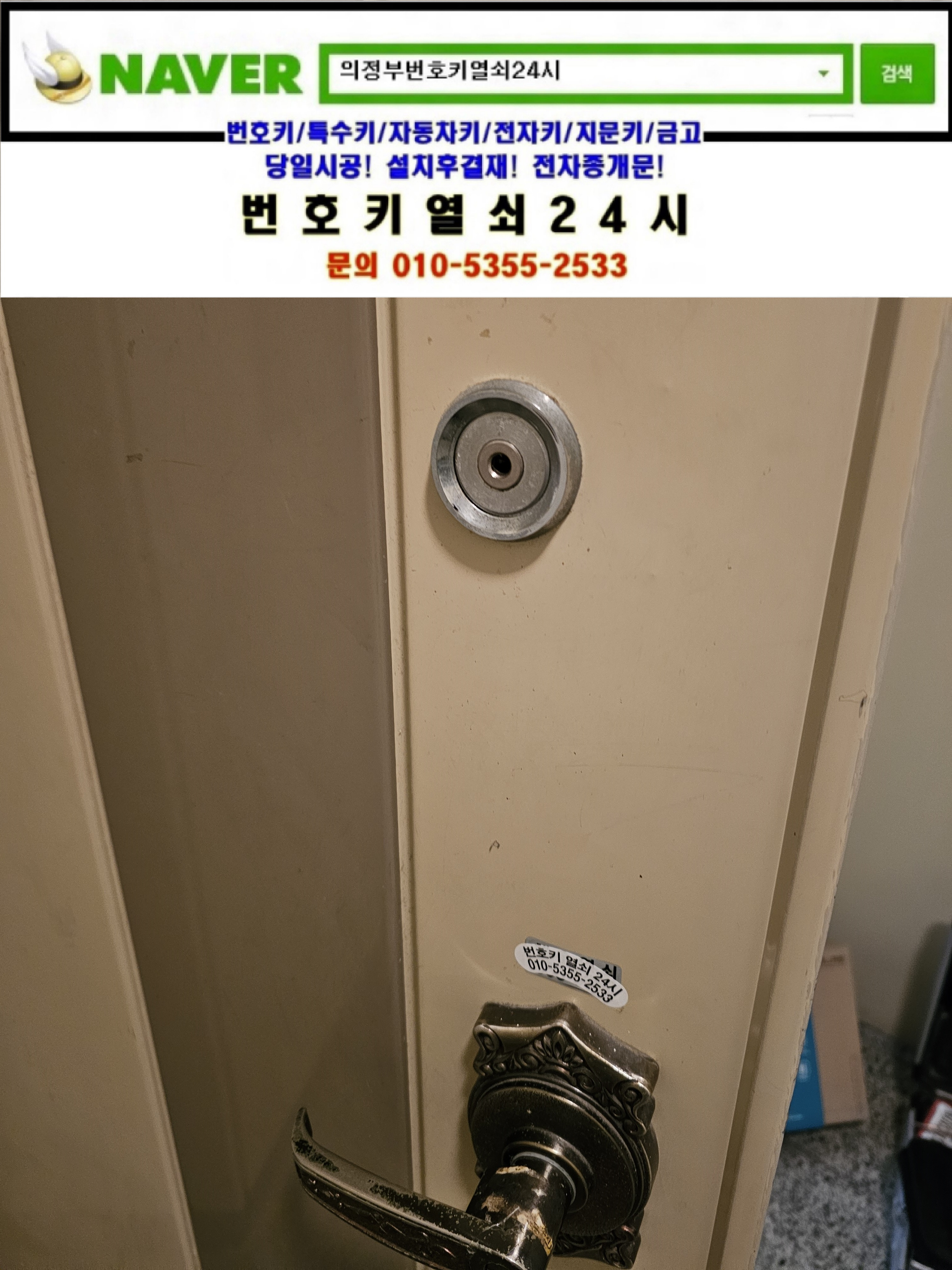 아파트에 번호키를 설치하려고하는데요. 비용이 얼마나하죠? 하면서 번호키열쇠24시를 찾으셔서 보조디지털도어락과 일체형주키도어락등을 설명드리고 설치할 제품링크안내를 해드리니 설치를 요청하셔서 현장으로가서 설치해드렸습니다.
