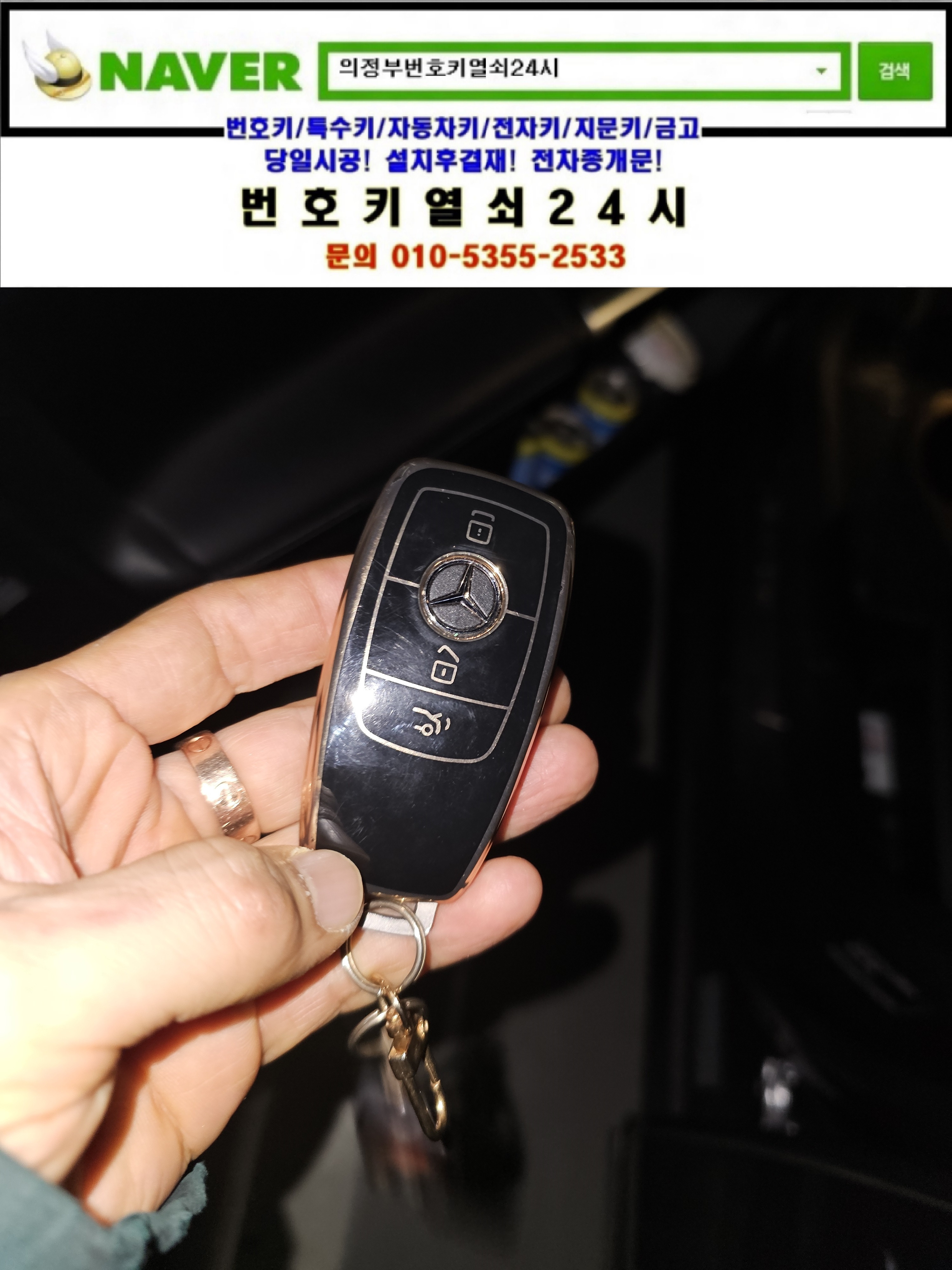 사장님 벤츠차량문이 잠겼는데 차키는 차안에 있어서 오셔서 열어주실수있나요? 하면서 번호키열쇠24시를 찾으셔서 어디시며 어떤차량인지 물어본후 출장비용을 안내해드리니 출장을 요청하셔서 현장으로가서 해결해드렸습니다.