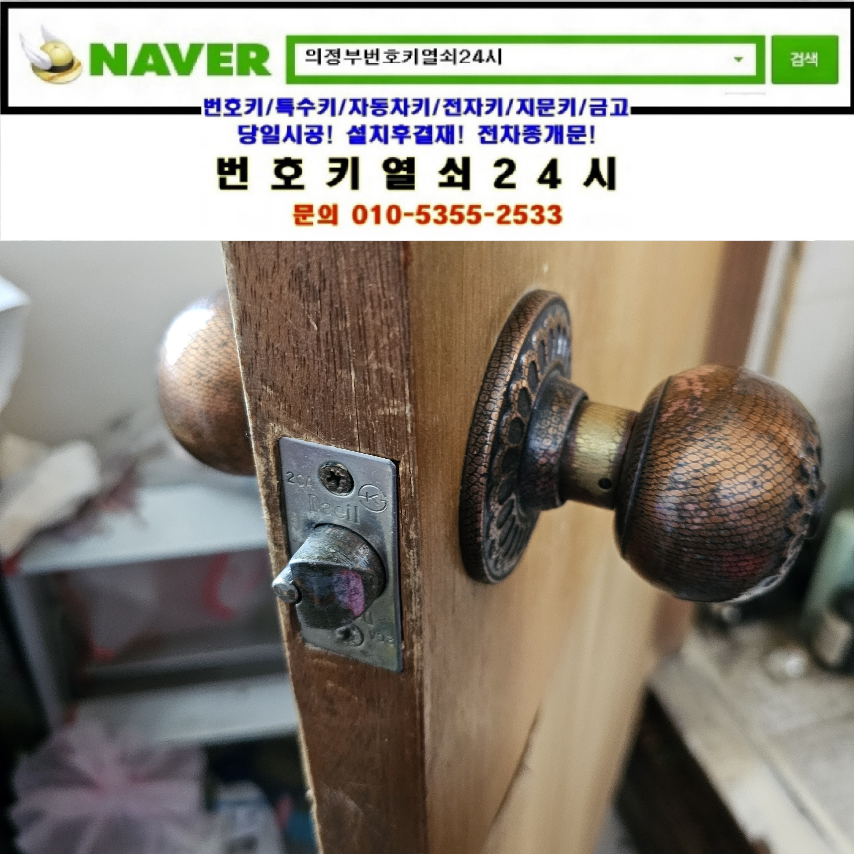 화장실문이 잠겼는데 이런것도 출장오셔서 열어주실수있나요? 하면서 번호키열쇠24시를 찾으셔서 어디시며 어떤방식의 문고리인지 사진을받고 비용을 안내해드린 출장을 요청하셔서 현장으로가서 해결해드렸습니다.