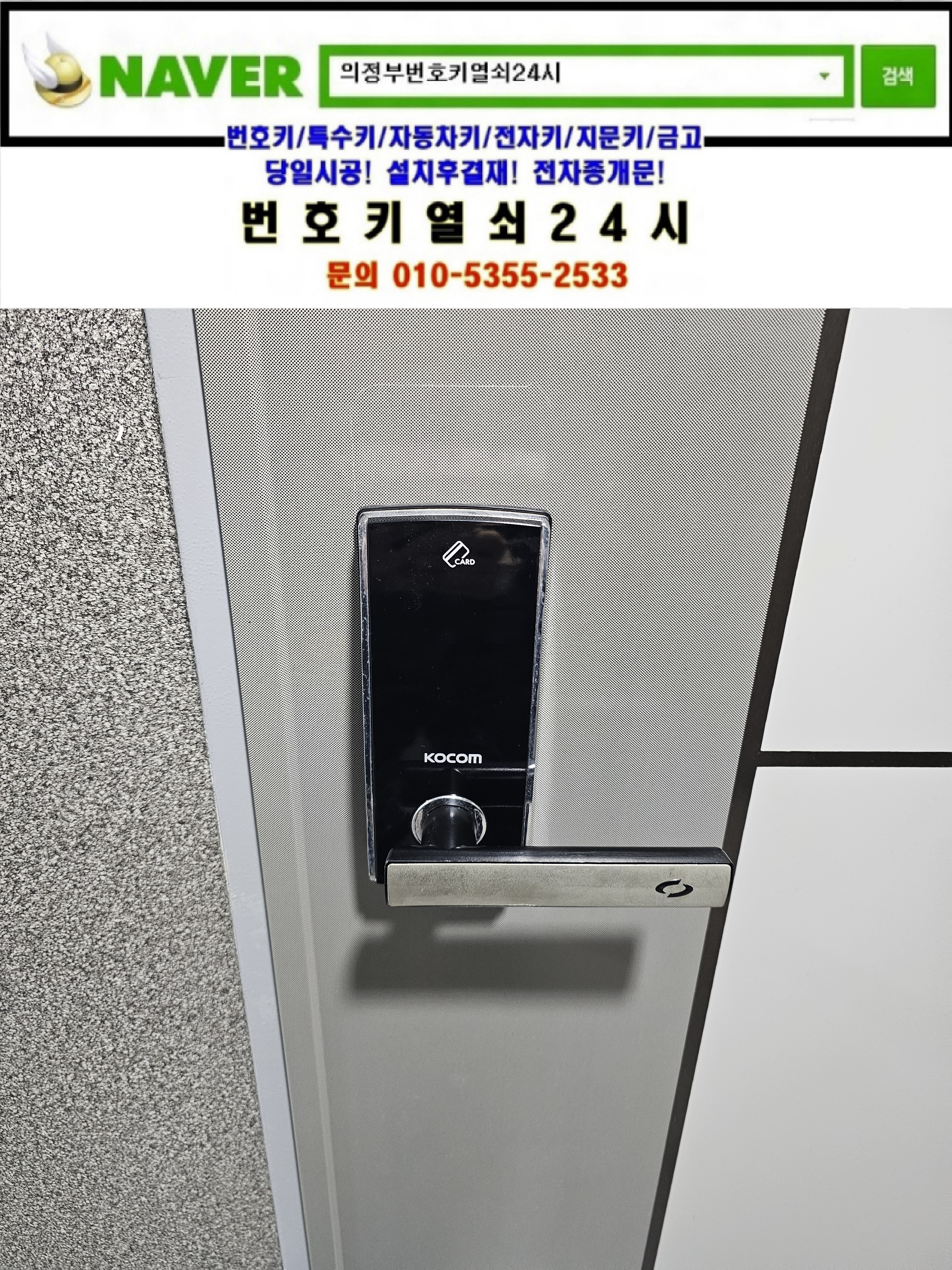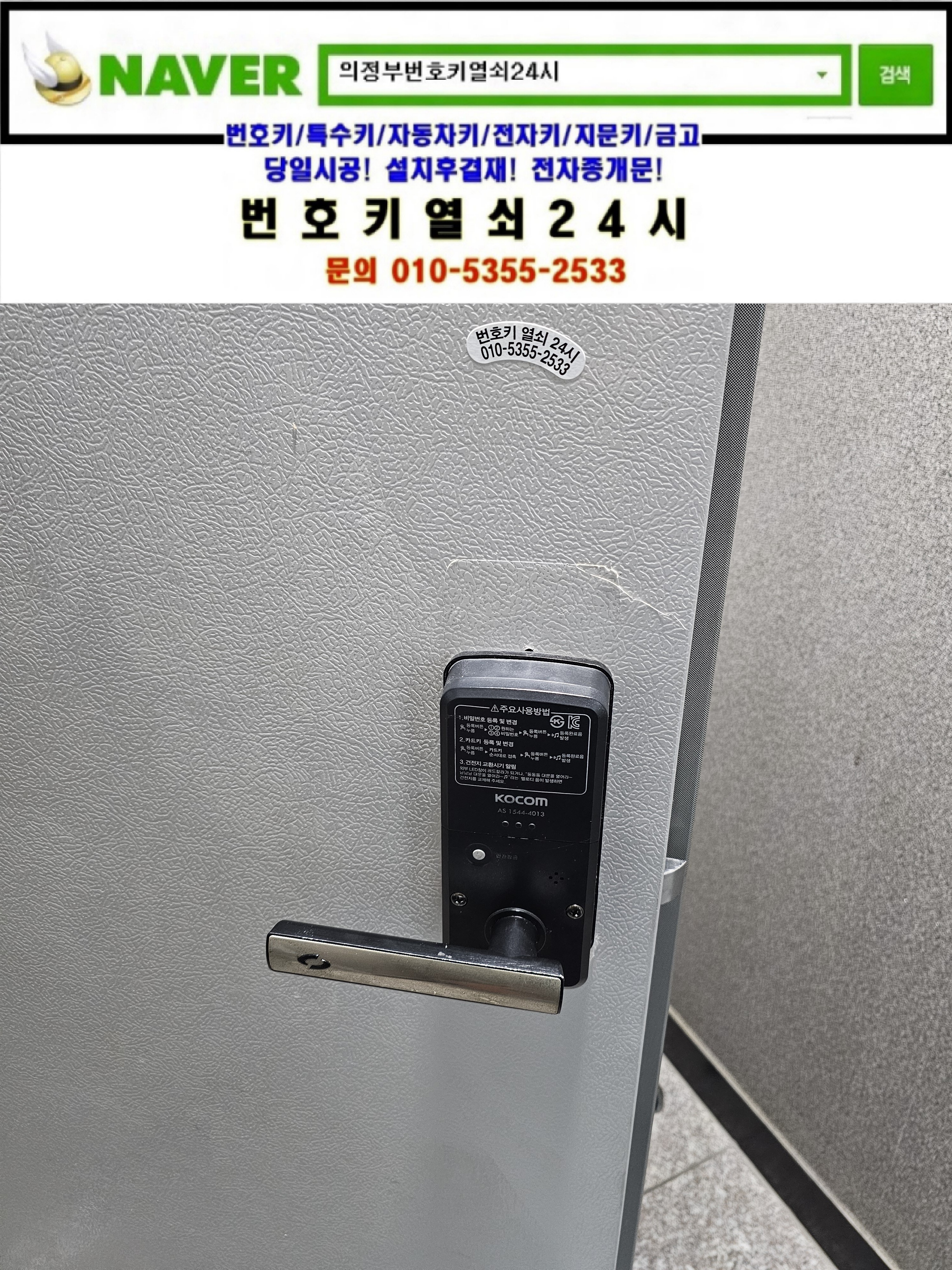 현장으로간곳은 의정부시 낙양동열쇠(민락동/민락2지구/용민로237번길35) **빌라입니다. 코콤레바주키도어락이 고장이나서 교체를 하신다고 보급형주키 m500n모델을 설치해드리고 정상작동확인과 설명드리고 철수합니다.tel:010-5355-2533