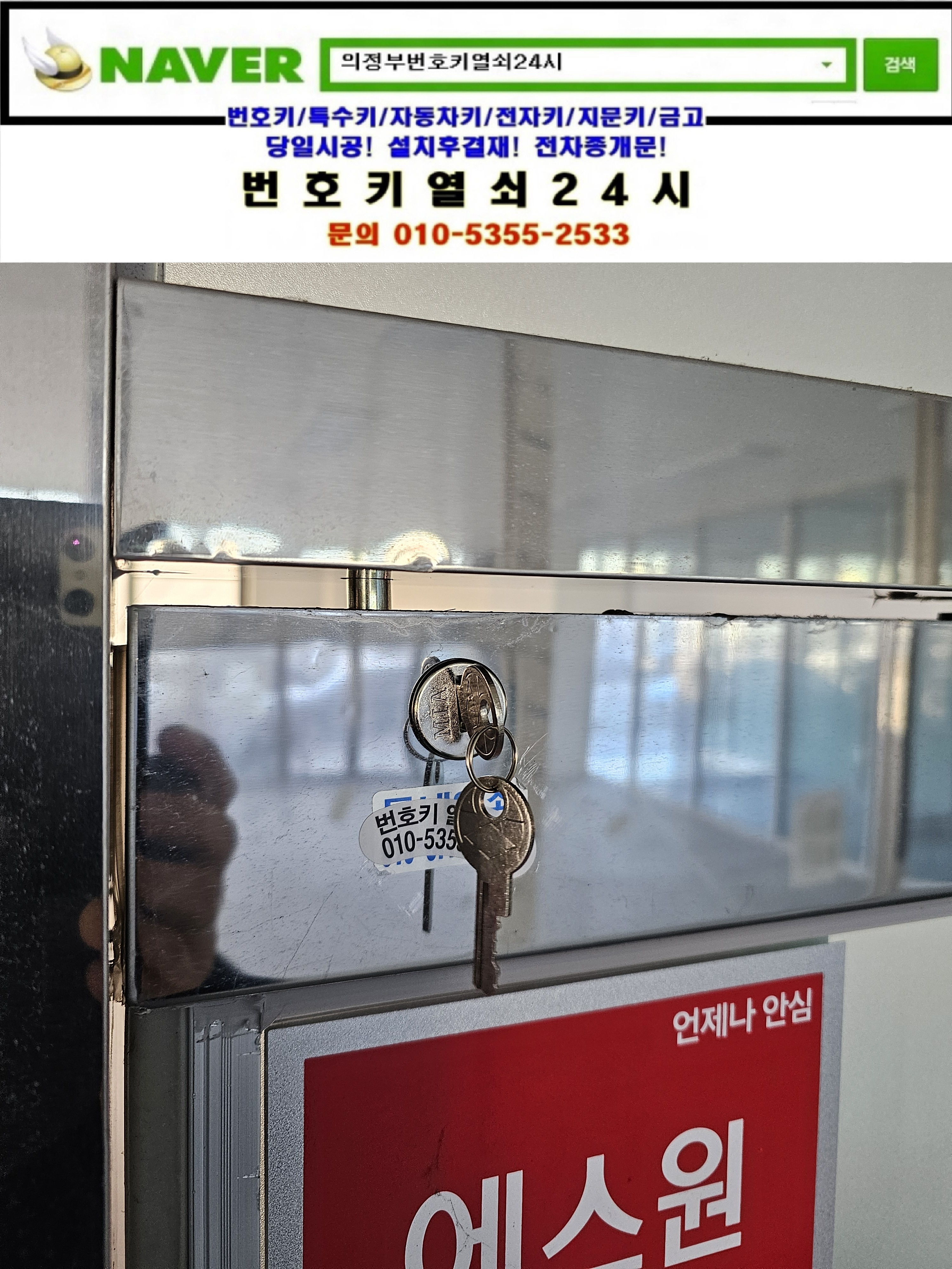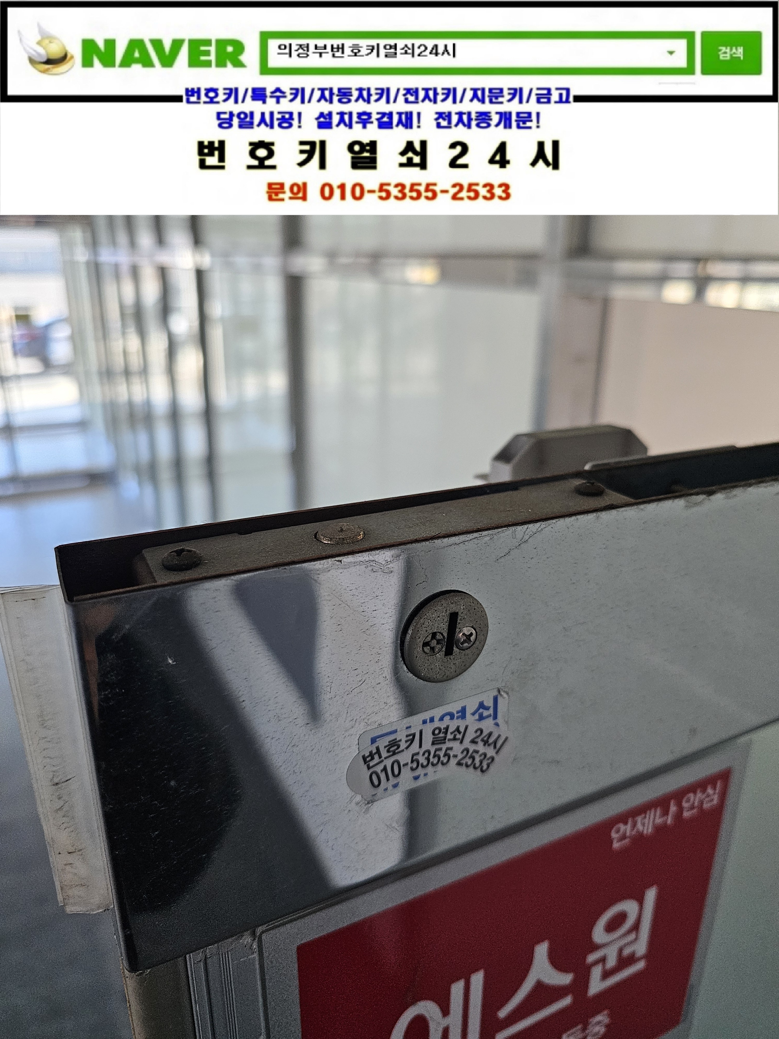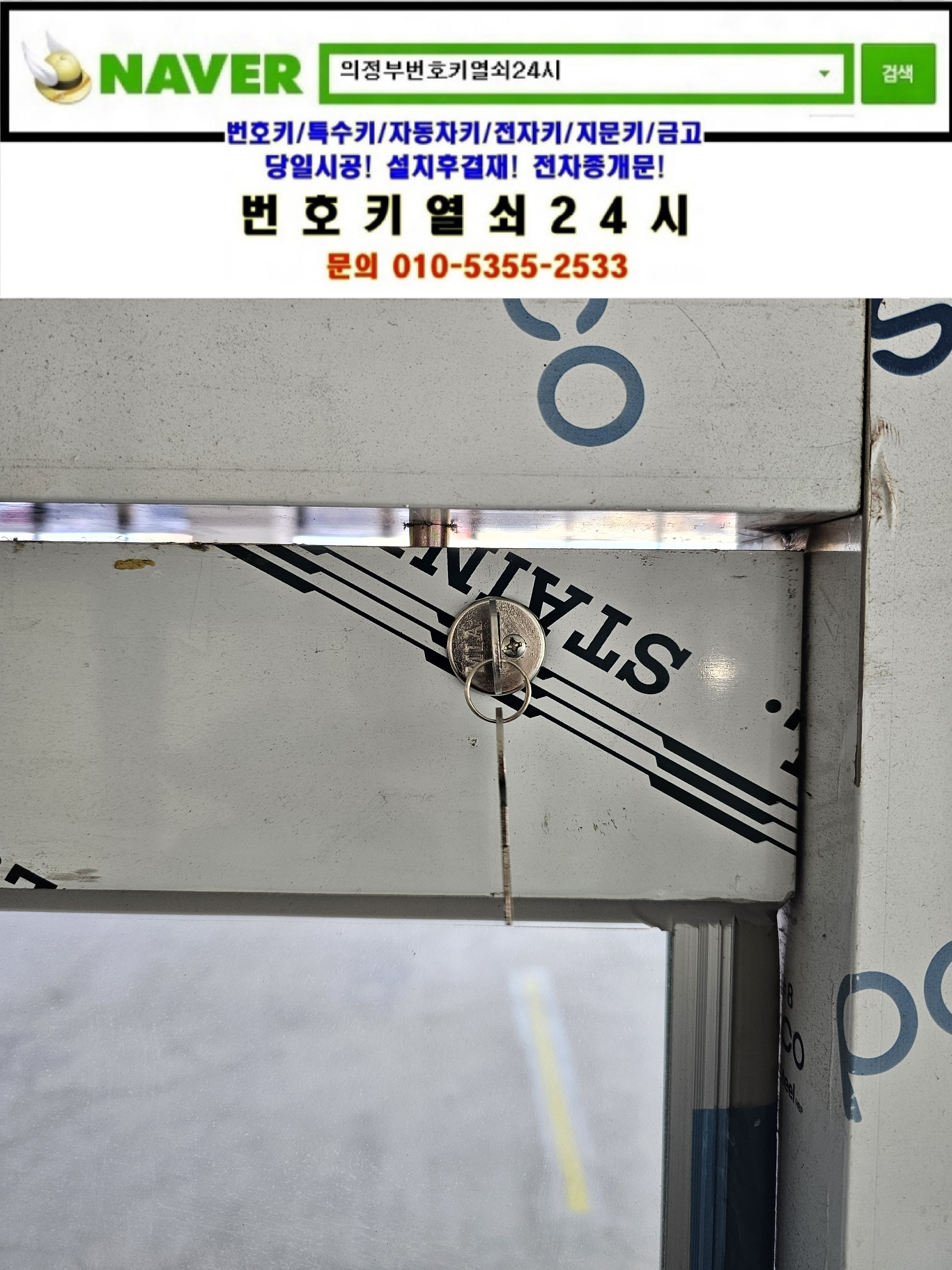 현장으로간곳은 의정부시 가능동열쇠(서부로720번길34) 녹양역부림스카이타워빌딩건물입니다. 강화유리문의 상단 기본열쇠가 없으셔서 기존 키박스를 탈거한뒤 새제품으로 교체설치하고 다른곳의 키박스도 교체설치후 설명드리고 철수합니다.tel:010-5355-2533