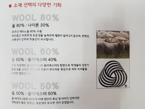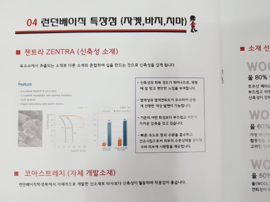 자켙 ; 울60% 폴리에스텔 40% 친환경섬유 젠트라 (기능성원단 스판)