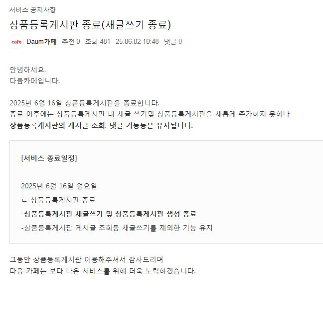 상품 등록 게시판이 없어지고 일반 게시판으로 바뀝니다. 작성자푸른별|작성시간25.06.22|조회수15 목록 댓글 0 글자크기 작게가 글자크기 크게가 이런 공지가 올라와 있네요. ㅎㅎㅎ 미치고 환장합니다. 다음검색 현재 게시글 추가 기능 열기 북마크 공유하기 신고 센터로 신고 댓글 댓글 0 댓글쓰기 답글쓰기 댓글 리스트