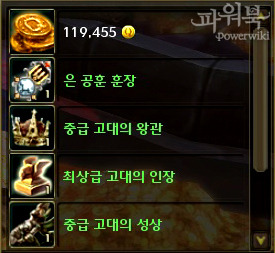 보물상자를 열면 공훈 훈장(은, 금), 고대의 유물 아이템(어비스 포인트와 교환), 신규 장비 아이템, 신규 퀘스트 아이템 등이 쏟아진다.