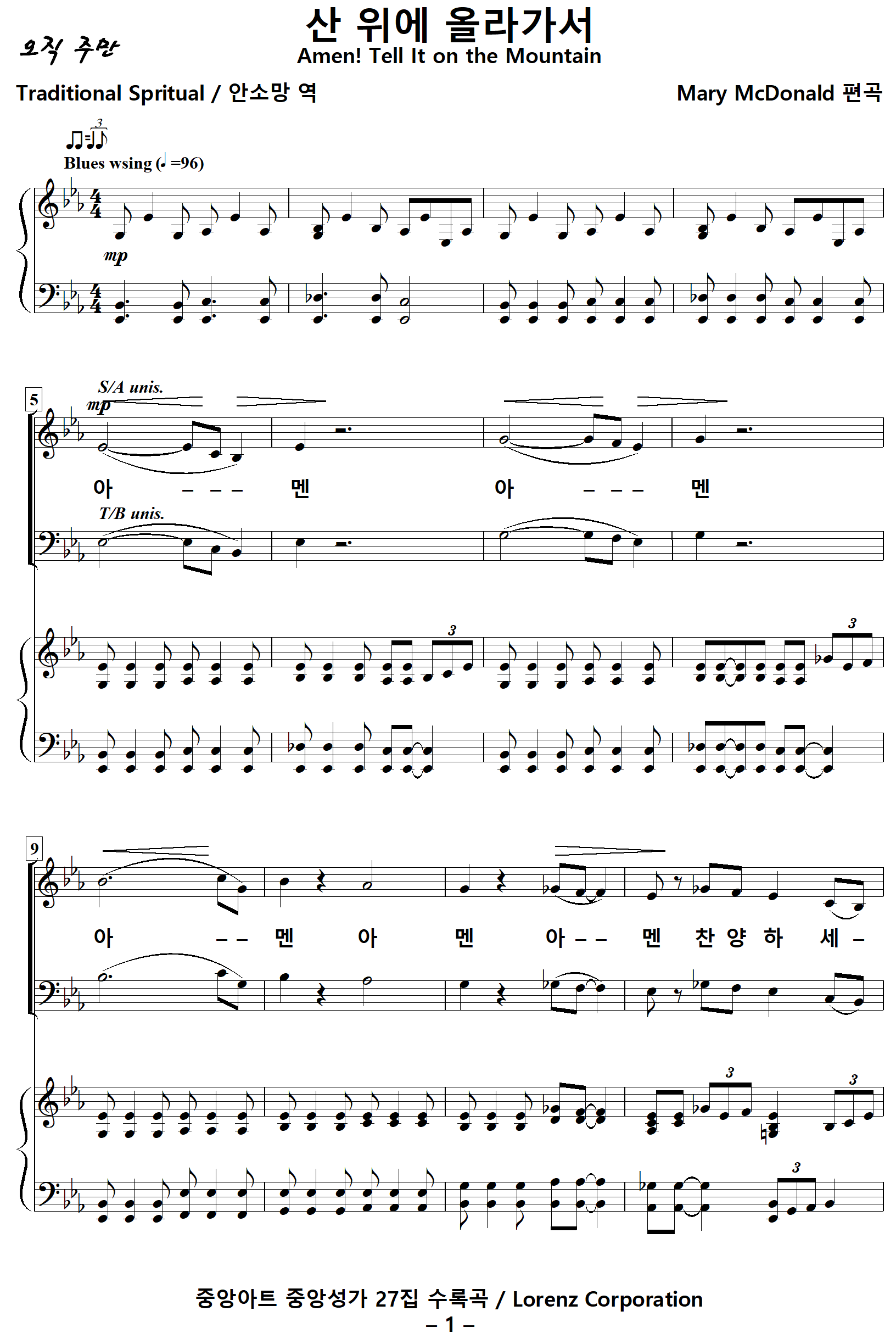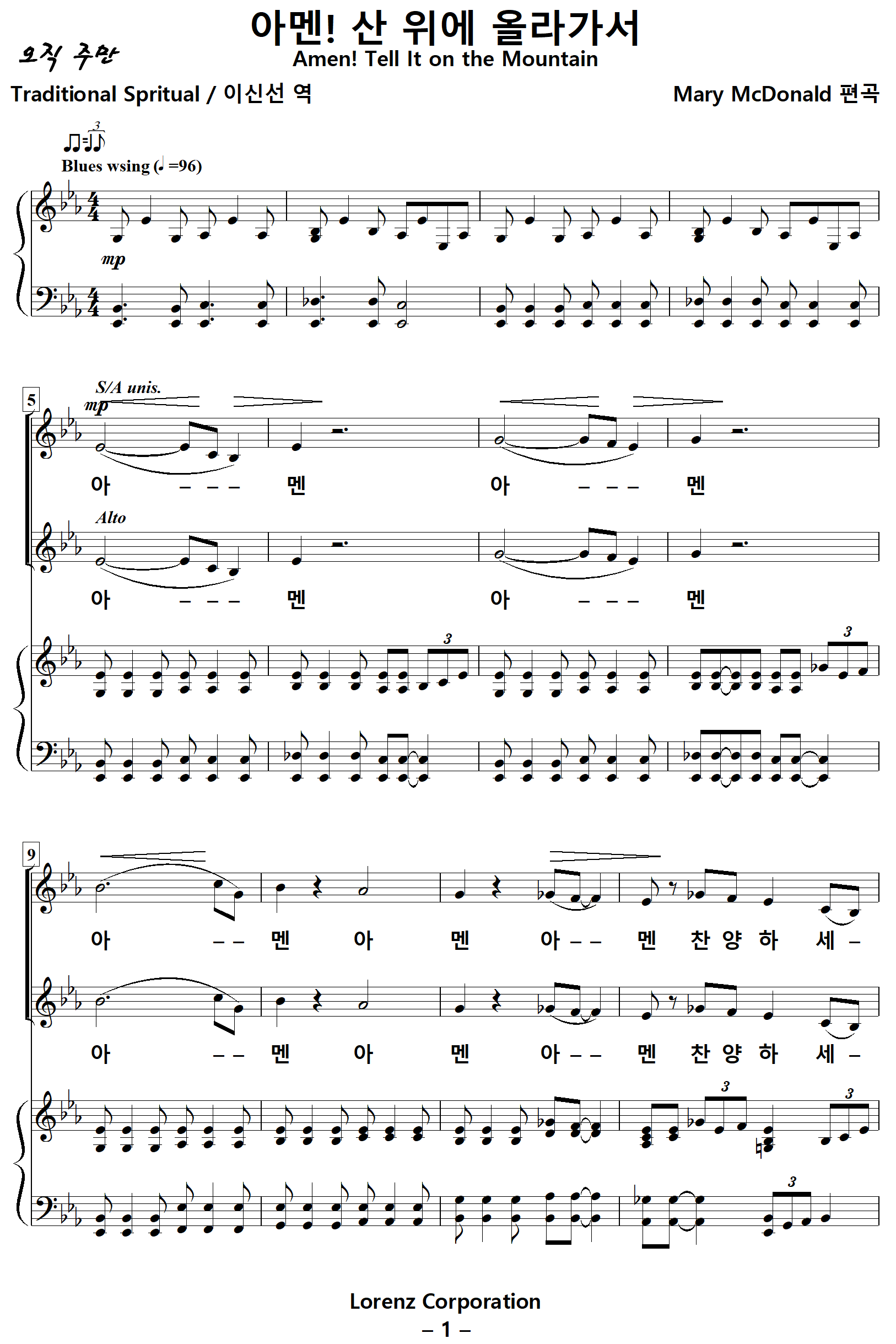 ** Mary McDonald 편곡의 이 악보는 혼성4부와 여성4부의 악보가 있습니다.