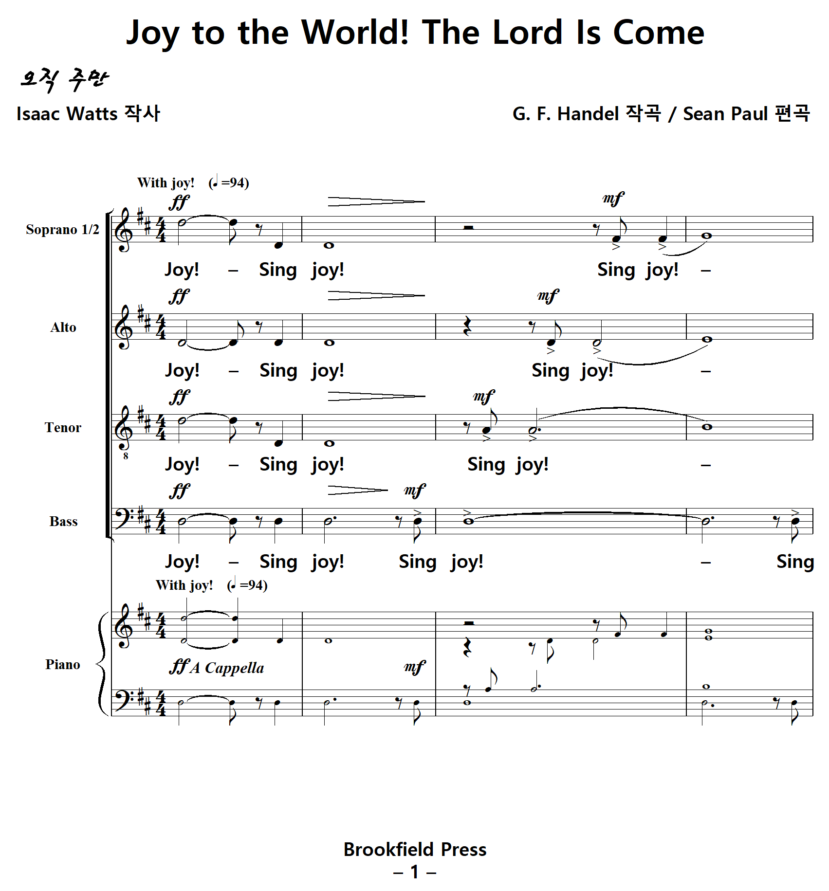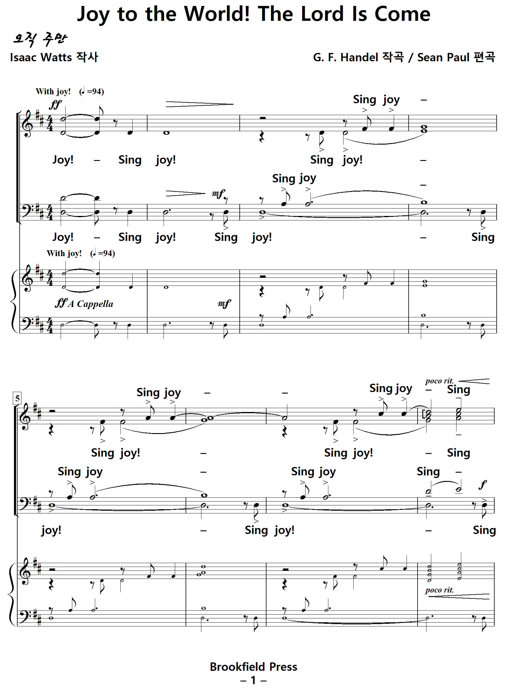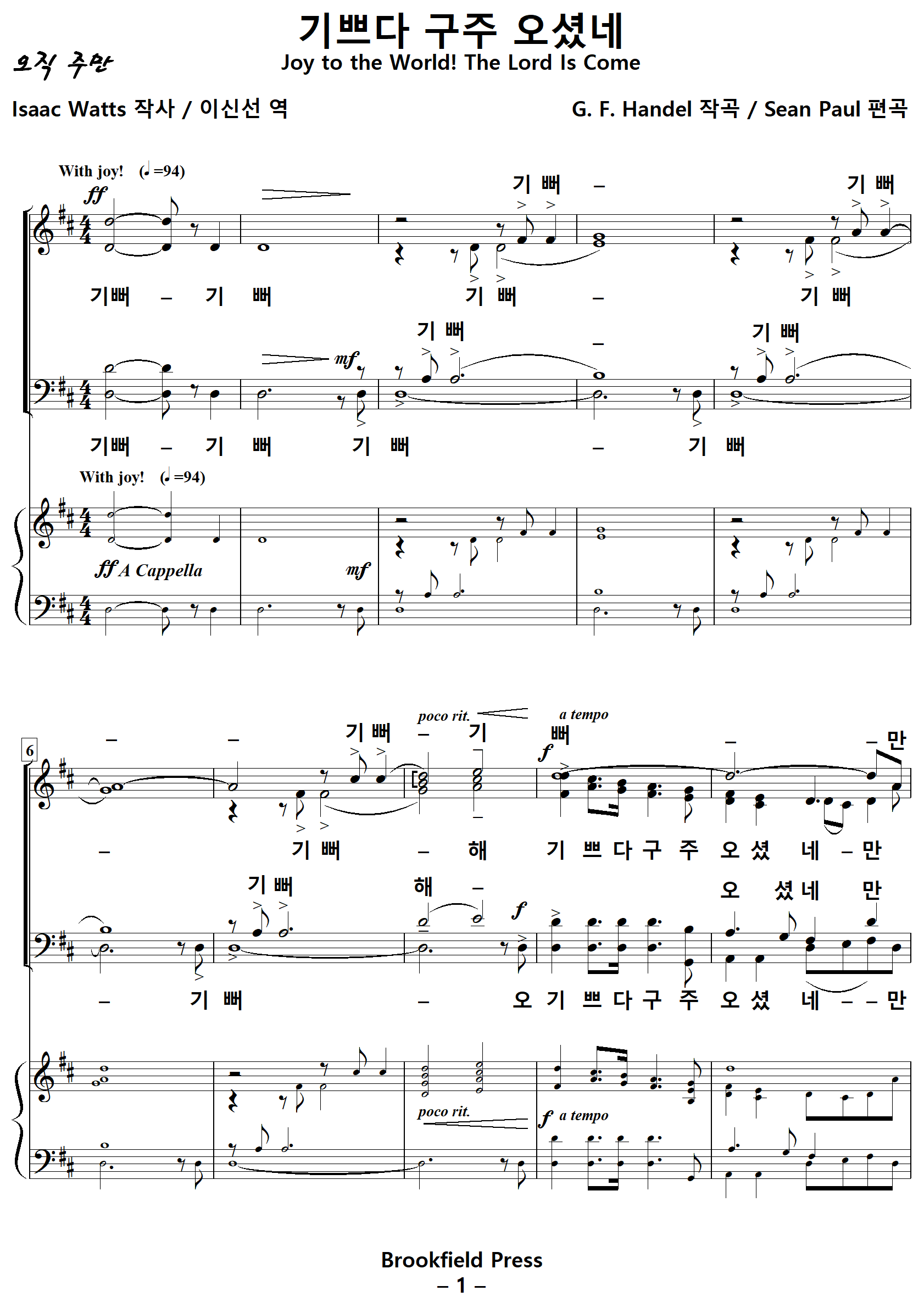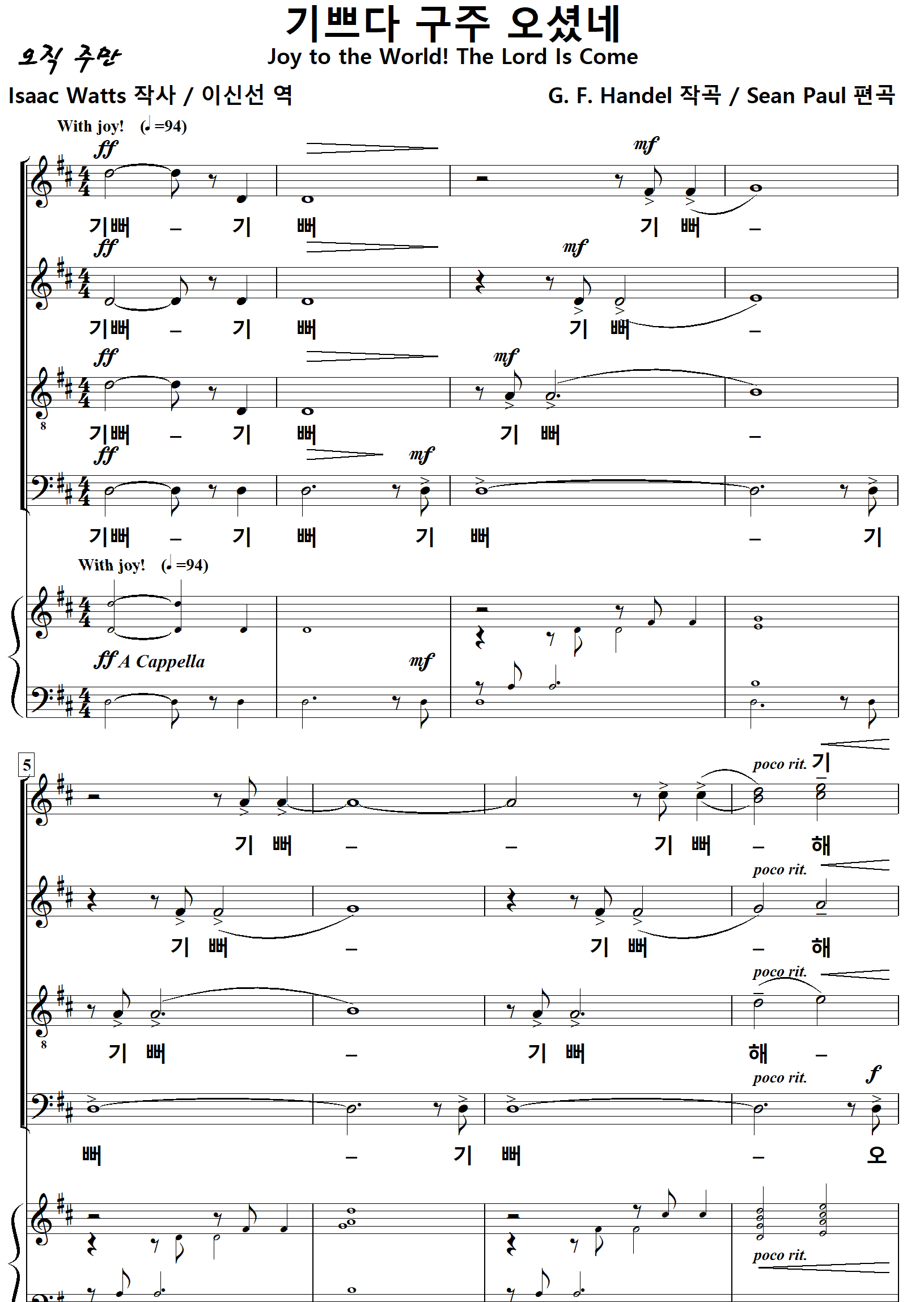 [성가악보] 기쁘다구주오셨네 / 기뻐기뻐기뻐 [Isaac Watts 작사, G. F. Handel 작곡, Sean Paul 편곡, 이신선 역]