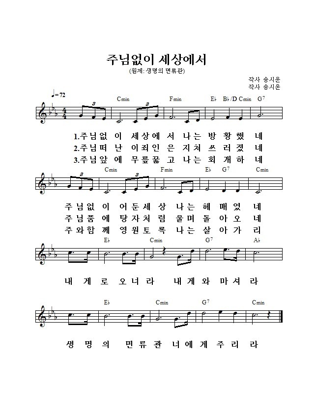 [찬양+악보]01. 생명의 면류관 / 주님없이 세상에서 (송시운작곡 1집) 작성자찬양하는바울|작성시간12.03.03|조회수156 목록 댓글 0 글자크기 작게가 글자크기 크게가 반주곡[MR]은 (연주모음 M.R)란에 올렸습니다. 첨부파일첨부된 파일이 2개 있습니다. jpg 파일 주님없이세상에서[1].jpg 다운로드 etc 파일 주님없이세상에서wma.wma 다운로드 다음검색 현재 게시글 추가 기능 열기 북마크 공유하기 신고 센터로 신고 댓글 댓글 0 댓글쓰기 답글쓰기 댓글 리스트