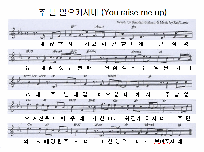 You raise me up so I can stand on mountains 당신이 나를 일으켜 주시기에 나는 산에 우뚝 서 있을수 있고 You raise me up to walk on stormy seas 당신이 나를 일으켜 주시기에 나는 폭풍의 바다도 건널수 있습니다 I am strong when I am on your shoulders 당신이 나를 떠받쳐 줄 때 나는 강인해 집니다 You raise me up to more than I can be 당신은 나를 일으켜 나보다 더 큰 내가 되게 합니다
