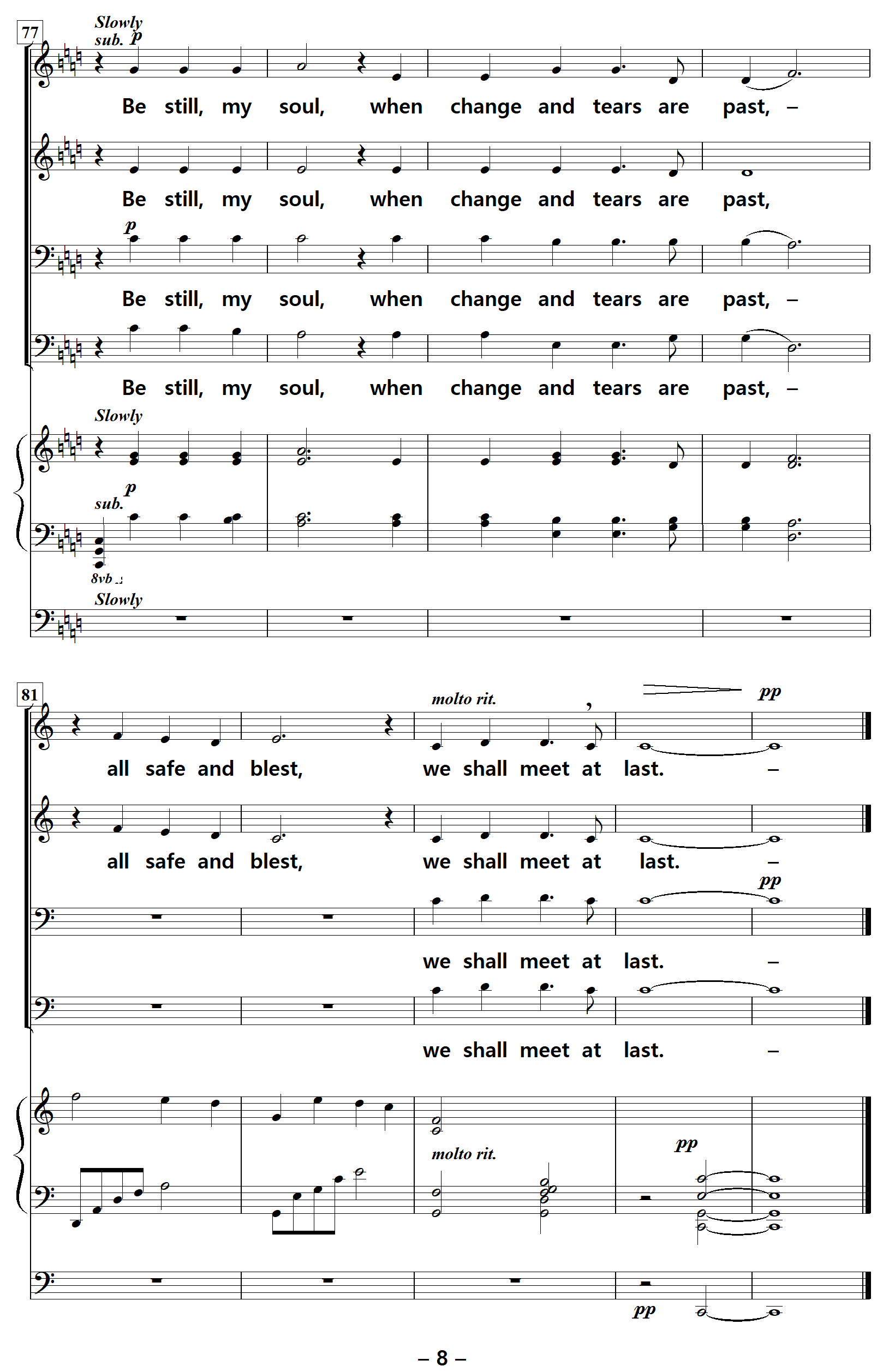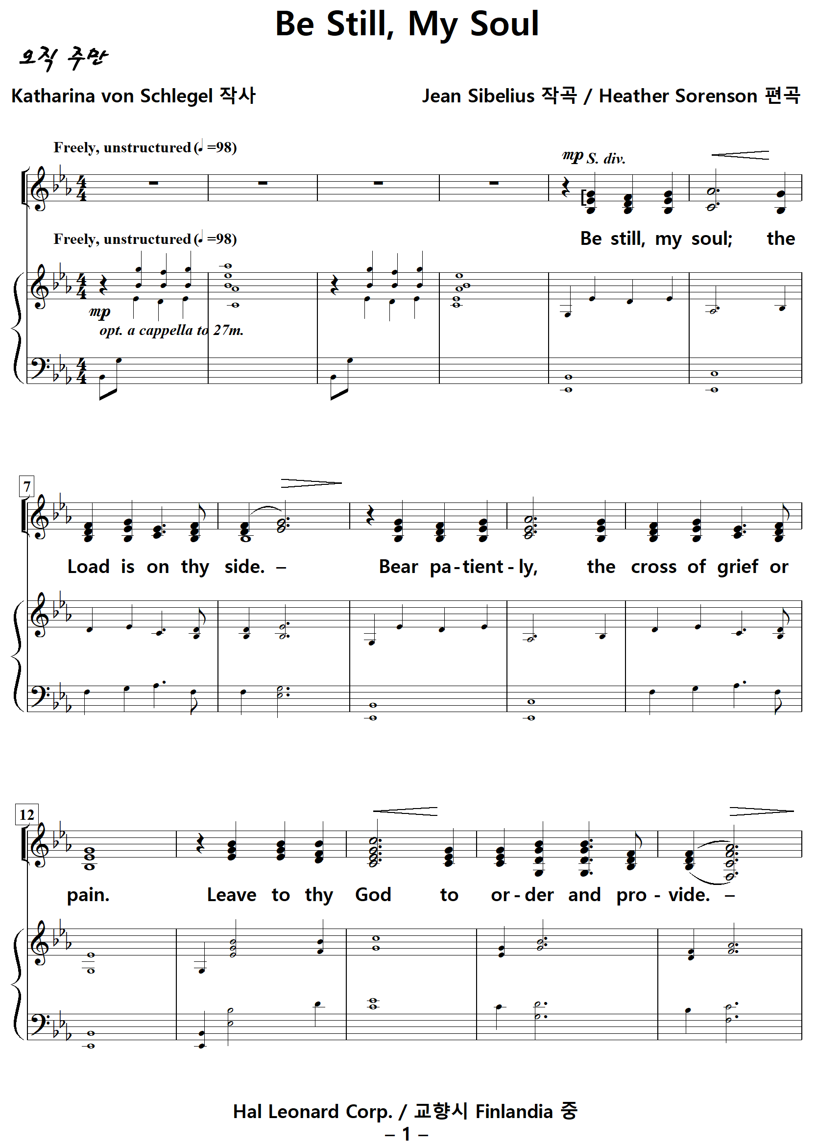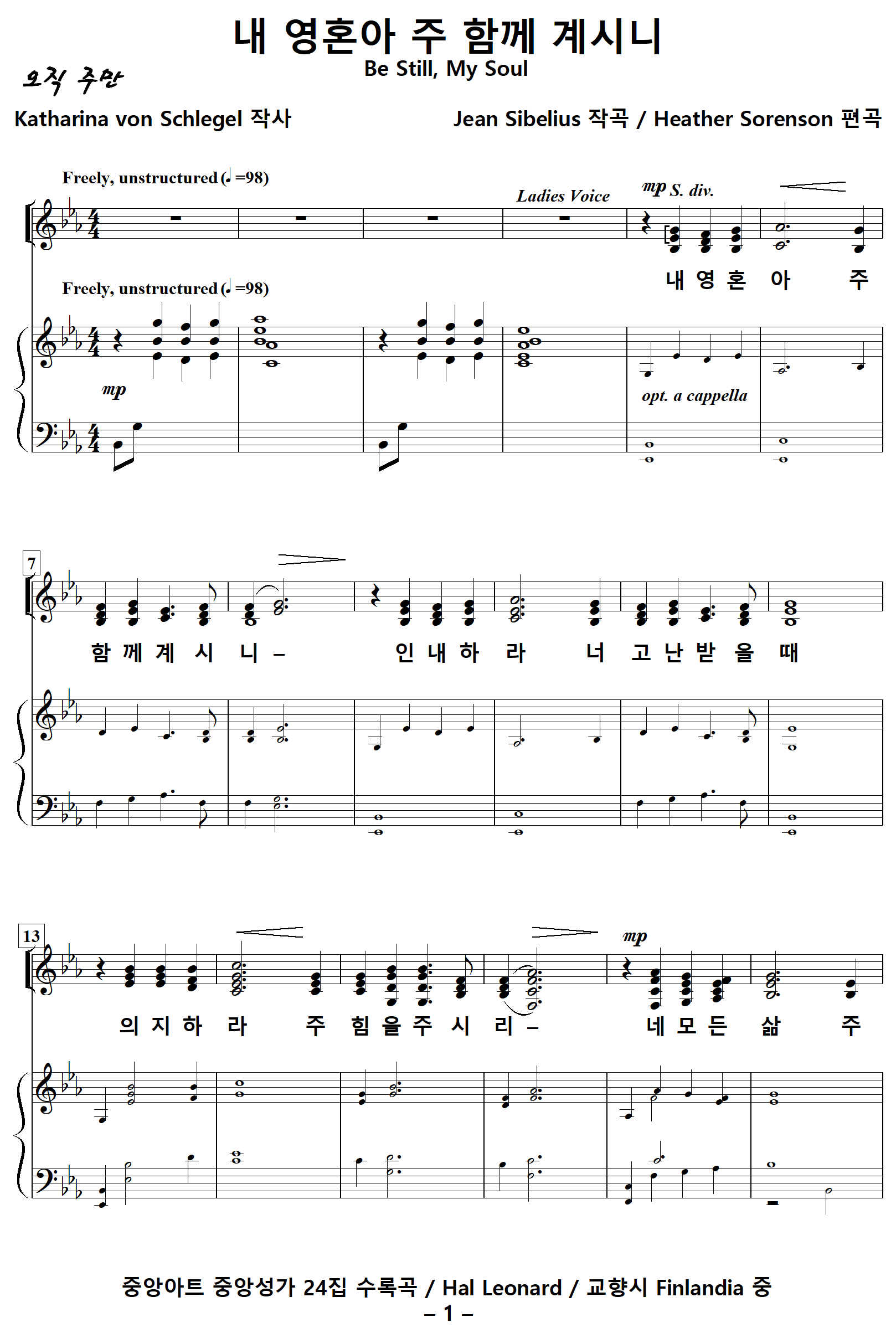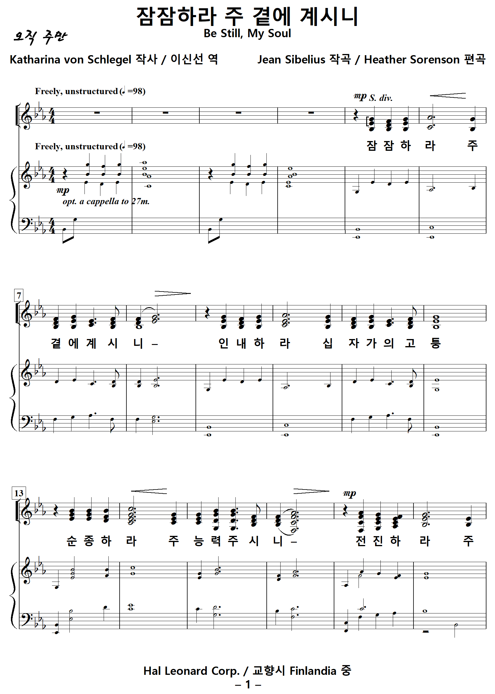 ** 이 악보는 동일악보 다른 번역가사로 코랄21 출판사에서 "내 영혼아 늘 평안하여라"란 제목으로도 출시되어 있습니다.