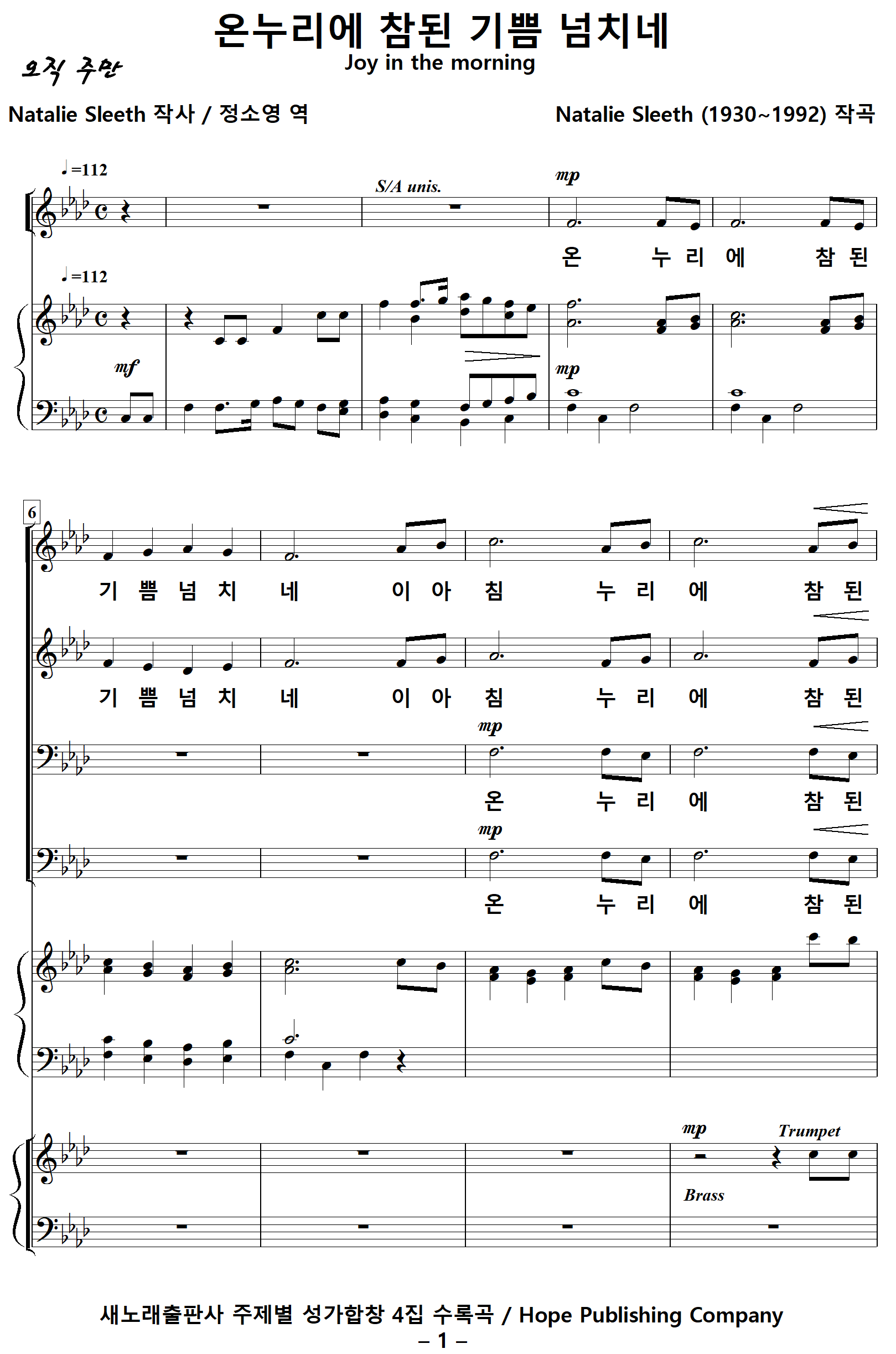 [성가악보] 온누리에참된기쁨넘치네 [Natalie Sleeth 작사, Natalie Sleeth 작곡, 정소영 역]