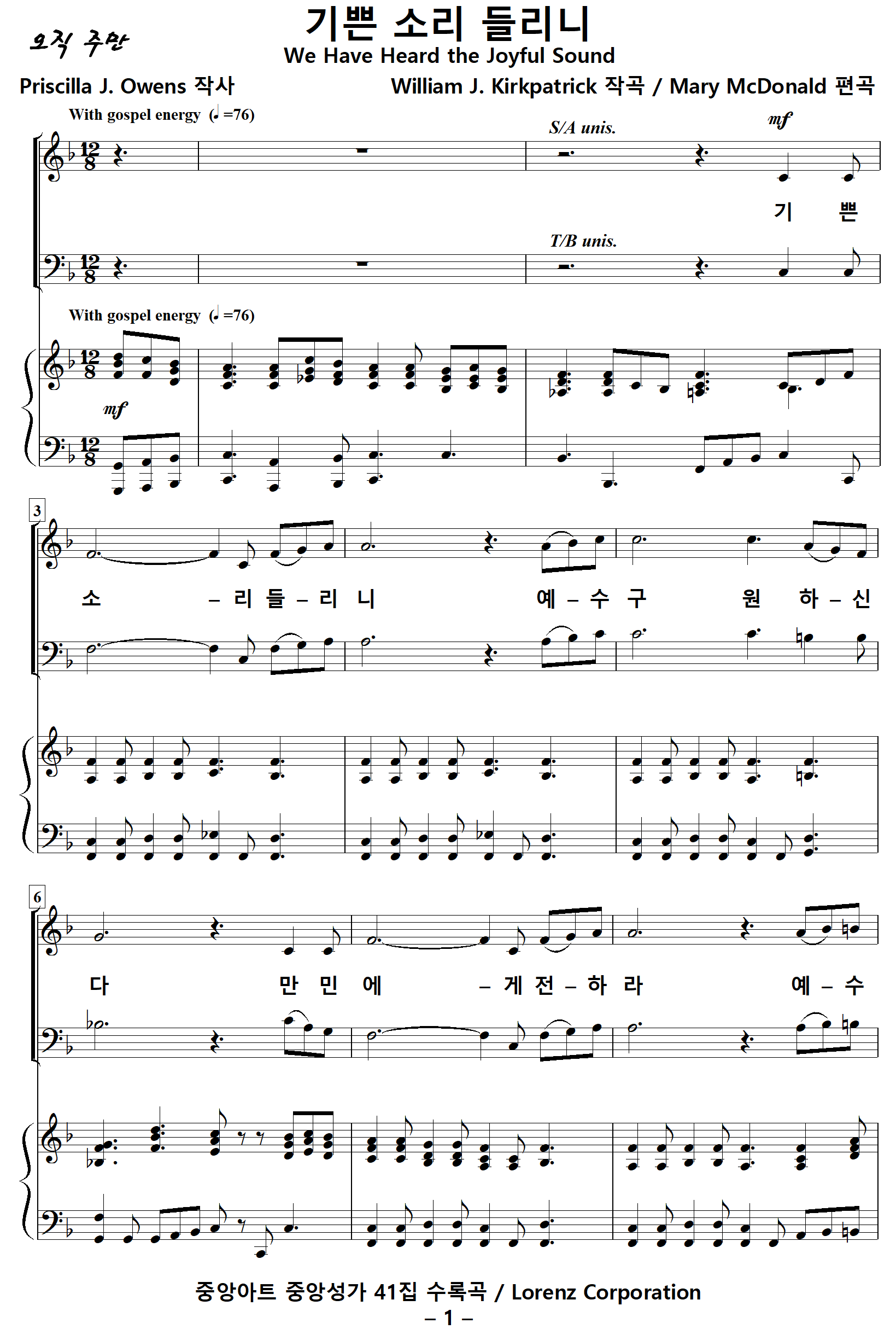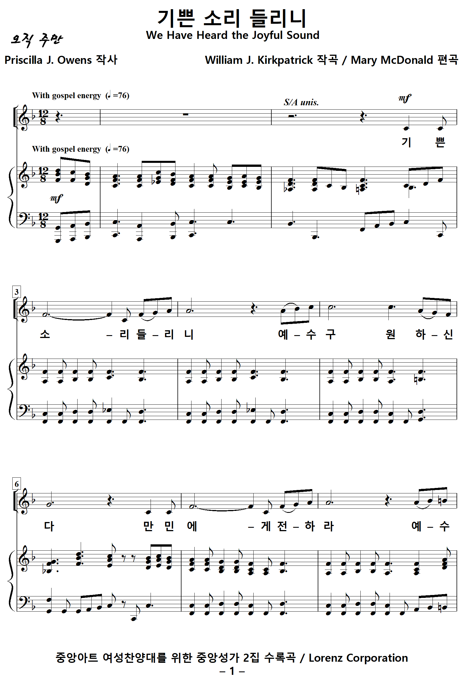 [찬양가사] 기쁜소리들리니 [Priscilla Owens 작사, William J. Kirkpatrick 작곡, Mary McDonald 편곡]