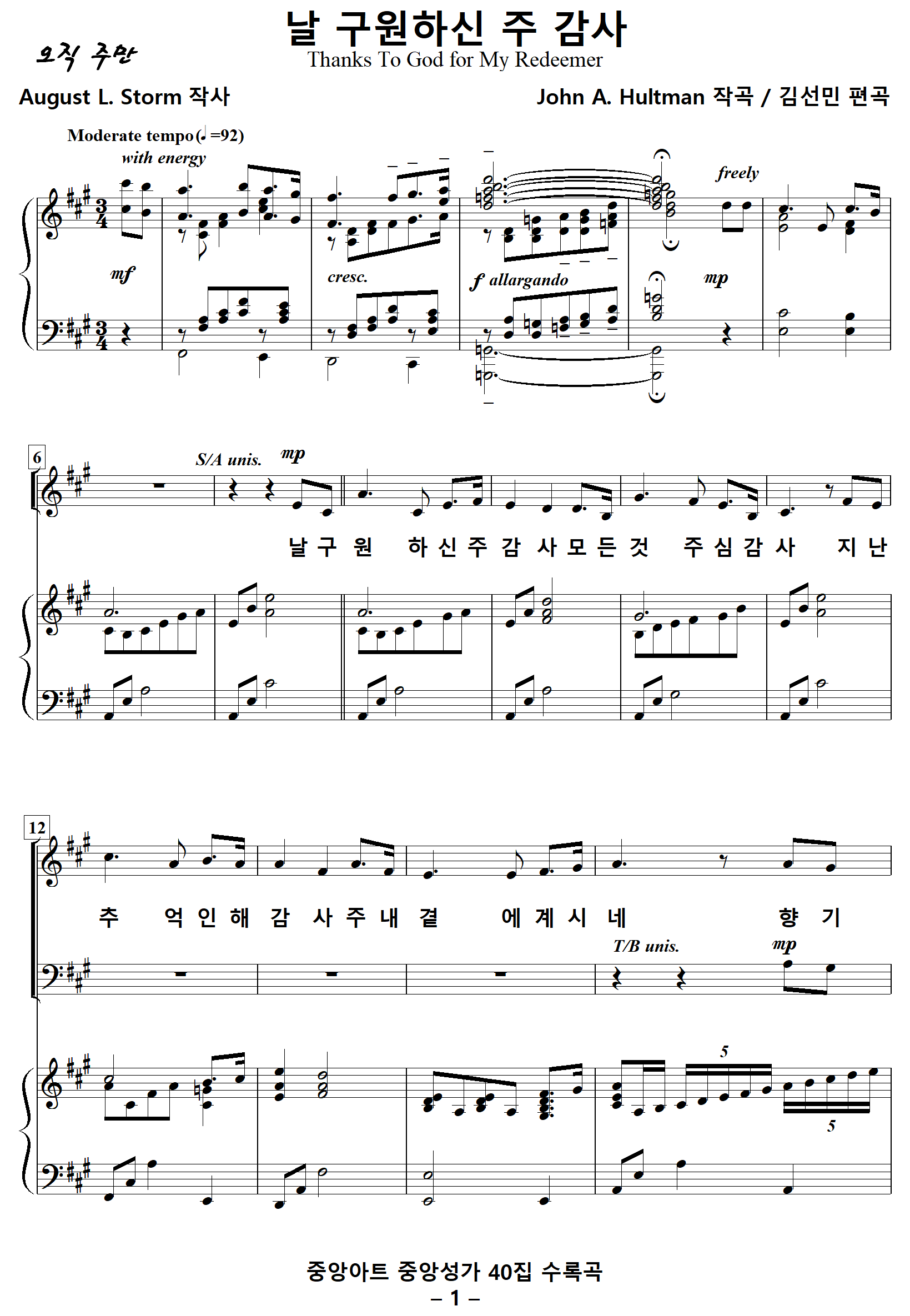 [찬양가사] 날구원하신주감사 / 감사찬송 [August L. Storm 작사, John A. Hultman 작곡, 김선민 편곡]