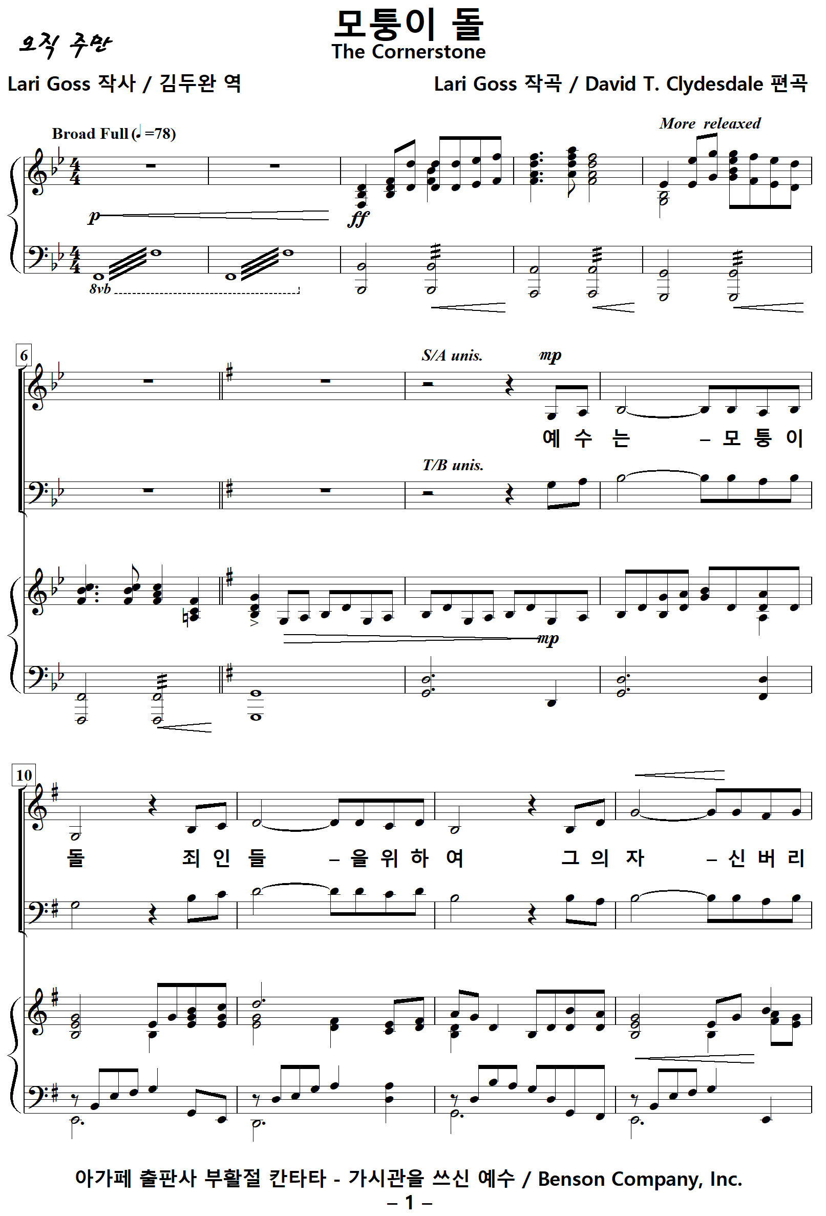 [찬양가사] 모퉁이돌 / 예수는모퉁이돌죄인들을위하여 [Lari Goss 작사, Lari Goss 작곡, David T. Clydesdale 편곡, 김두완 역]