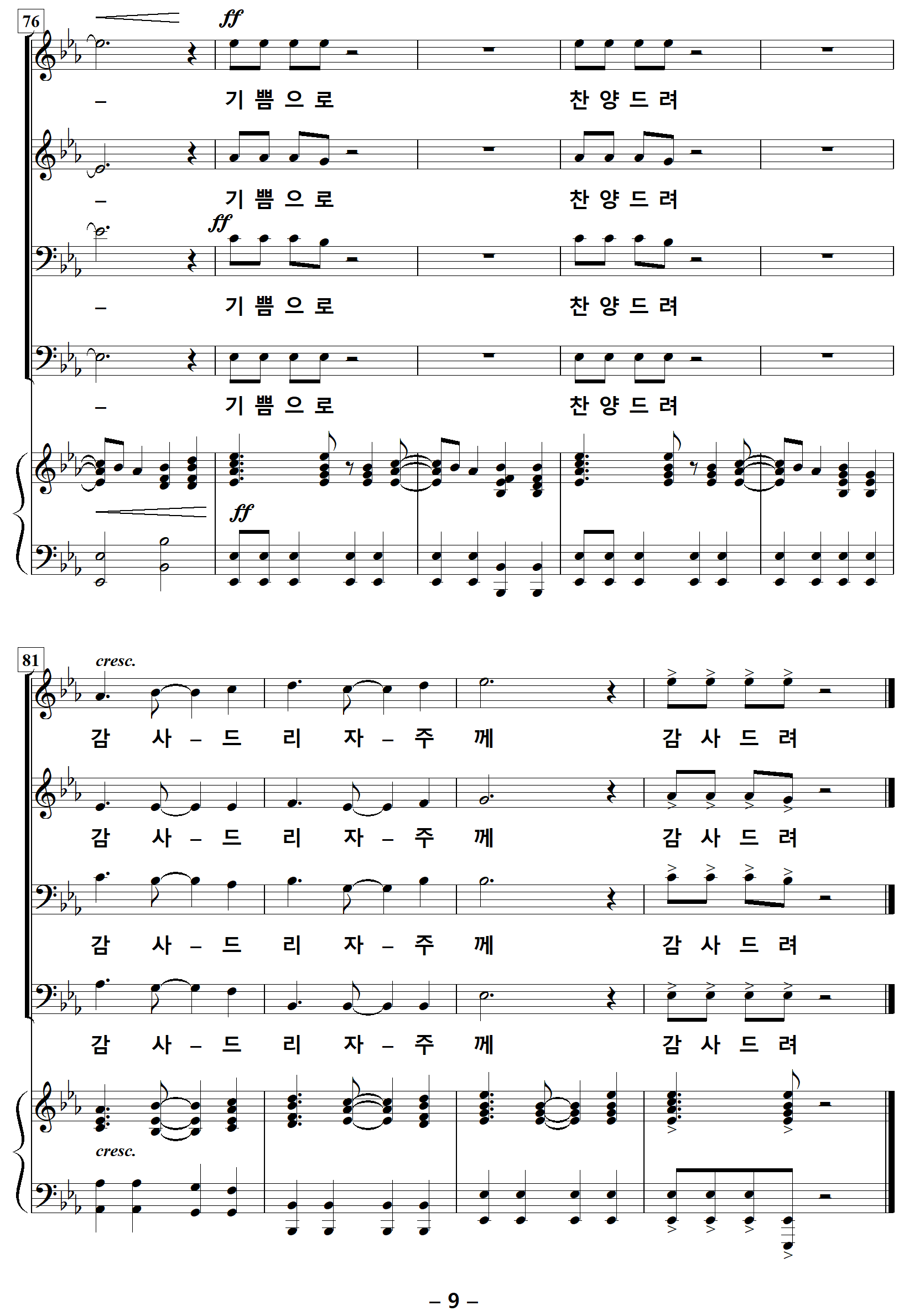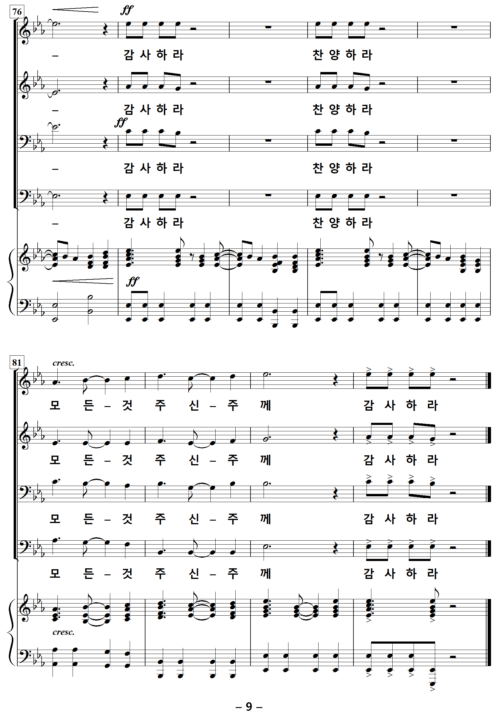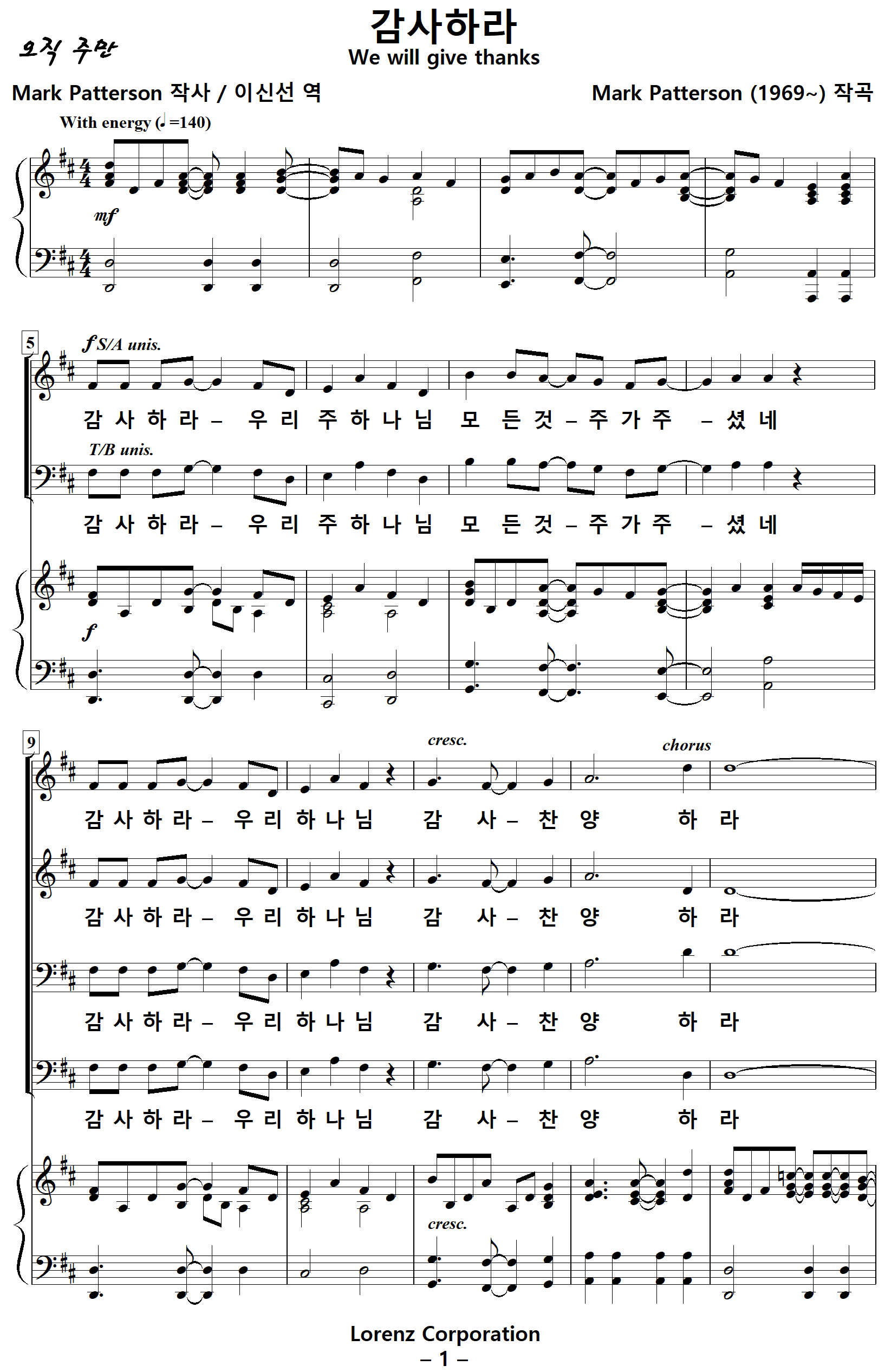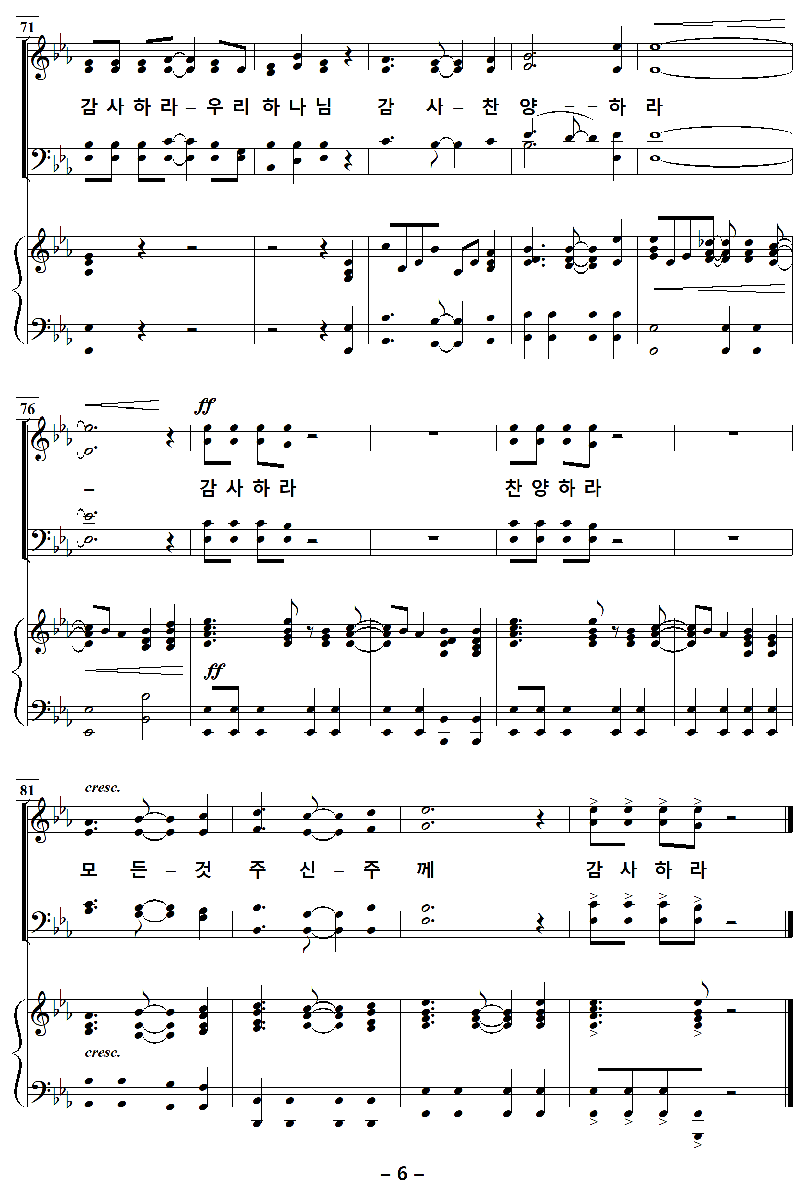 ** 혼성2부 악보와 혼성4부 악보가 있으며 "감사하라", "감사드려 우리 하나님" 제목으로 불려지고 있습니다.