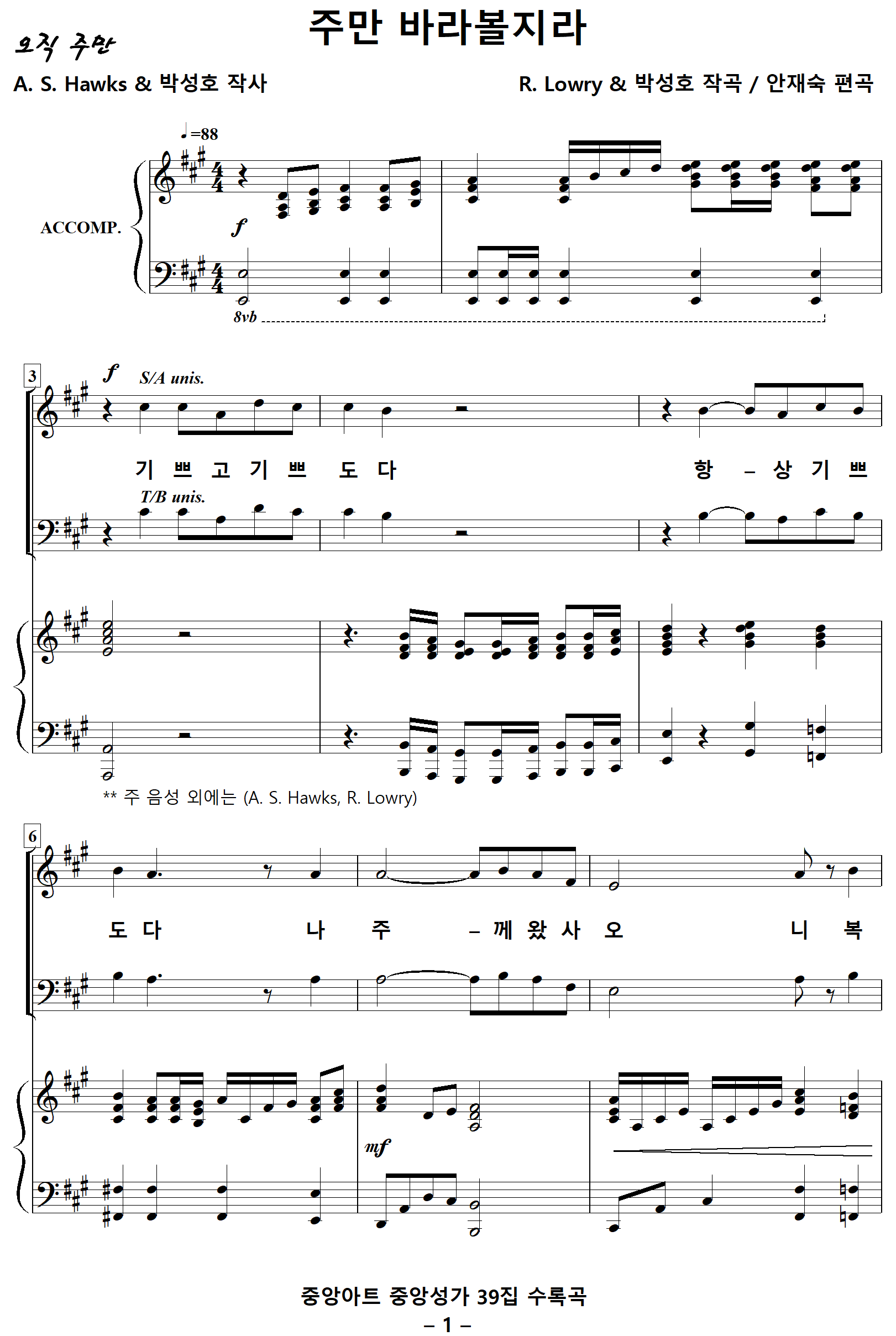 [성가악보] 주만바라볼지라 / 기쁘고기쁘도다 [A. S. Hawks & 박성호 작사, R. Lowry & 박성호 작곡, 안재숙 편곡]