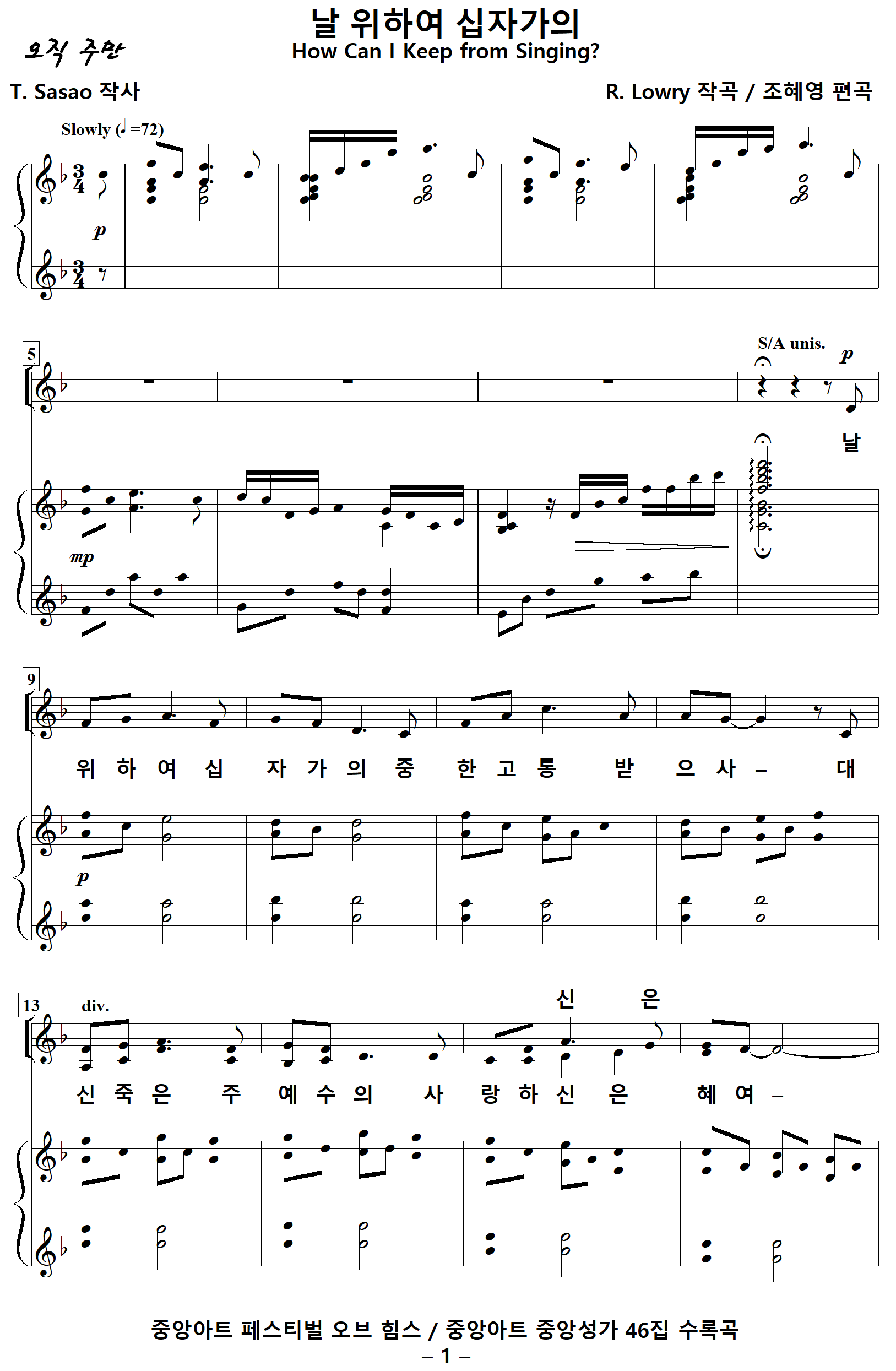 [찬양가사] 날위하여십자가의 [T. Sasao 작사, R. Lowry 작곡, 조혜영 편곡]