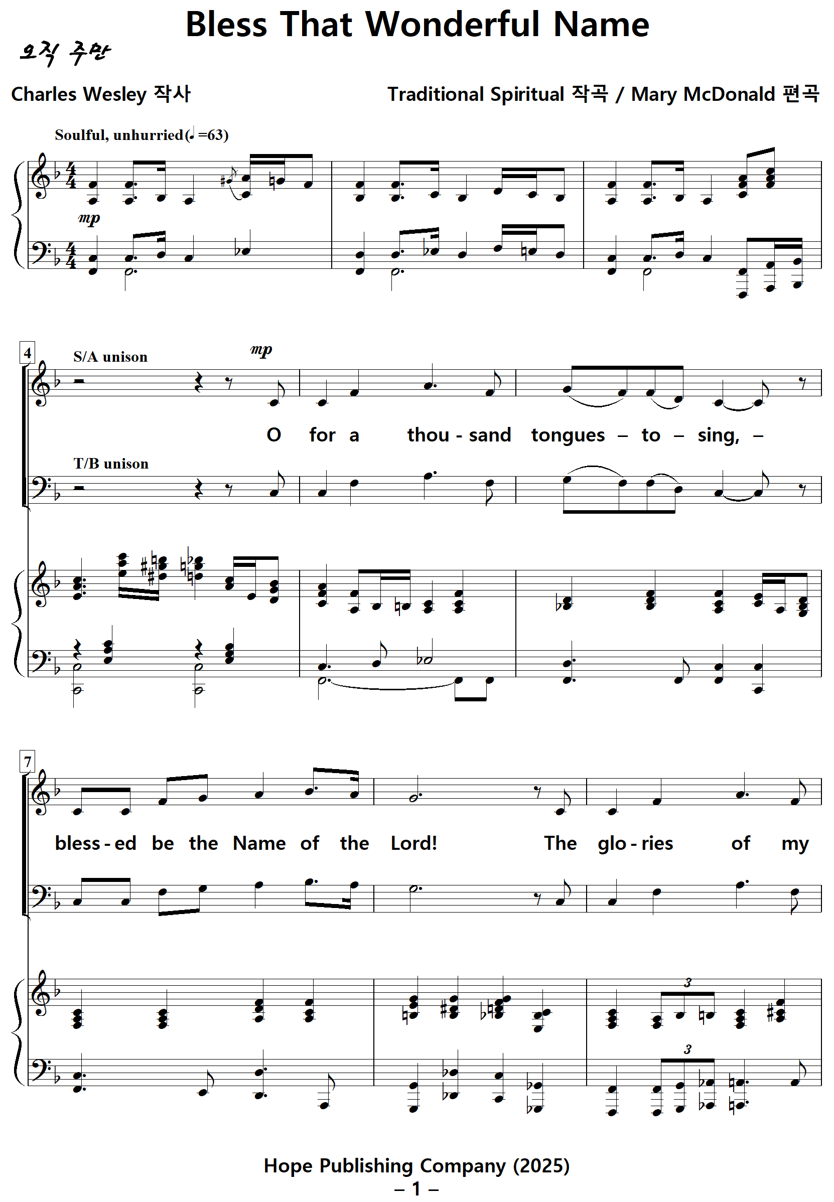 [찬양가사] Bless That Wonderful Name / O for a thousand tongues [Charles Wesley 작사, Traditional Spiritual 작곡, Mary McDonald 편곡]
