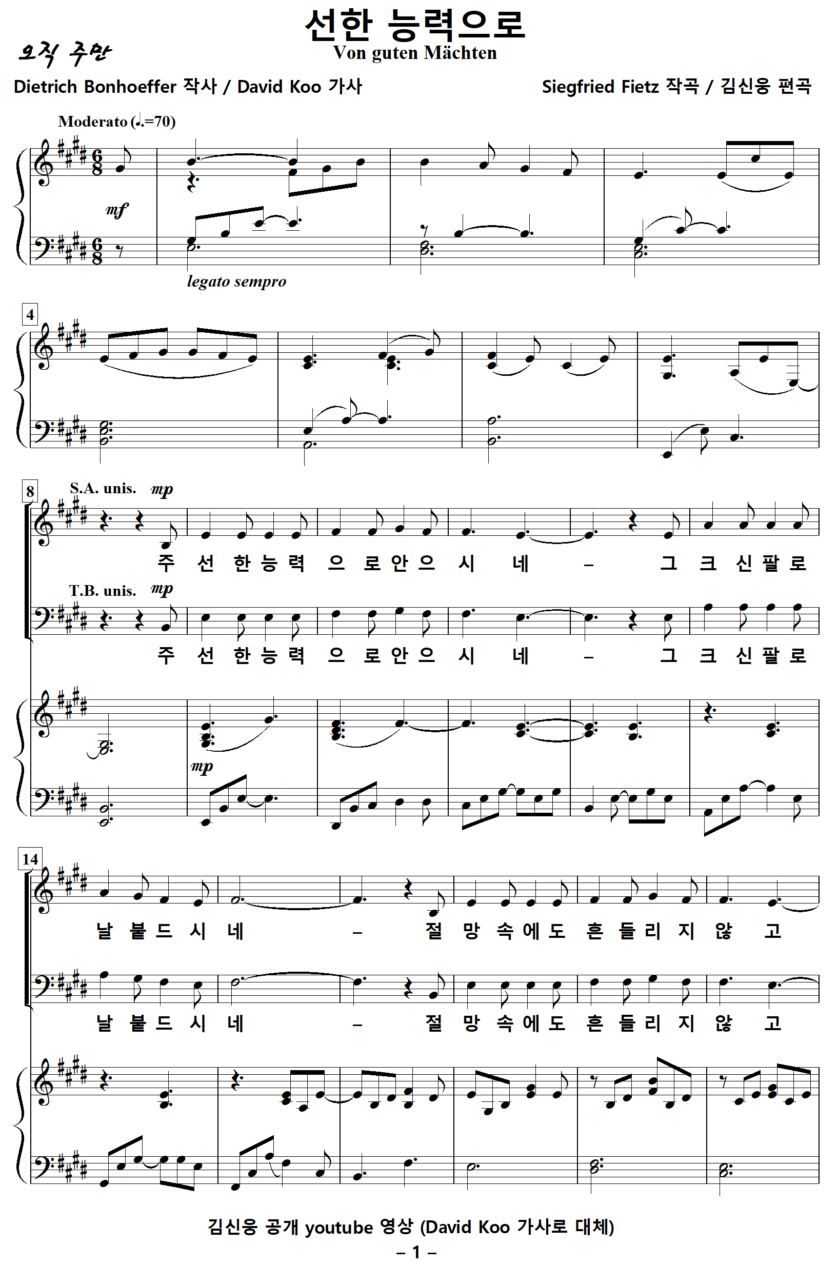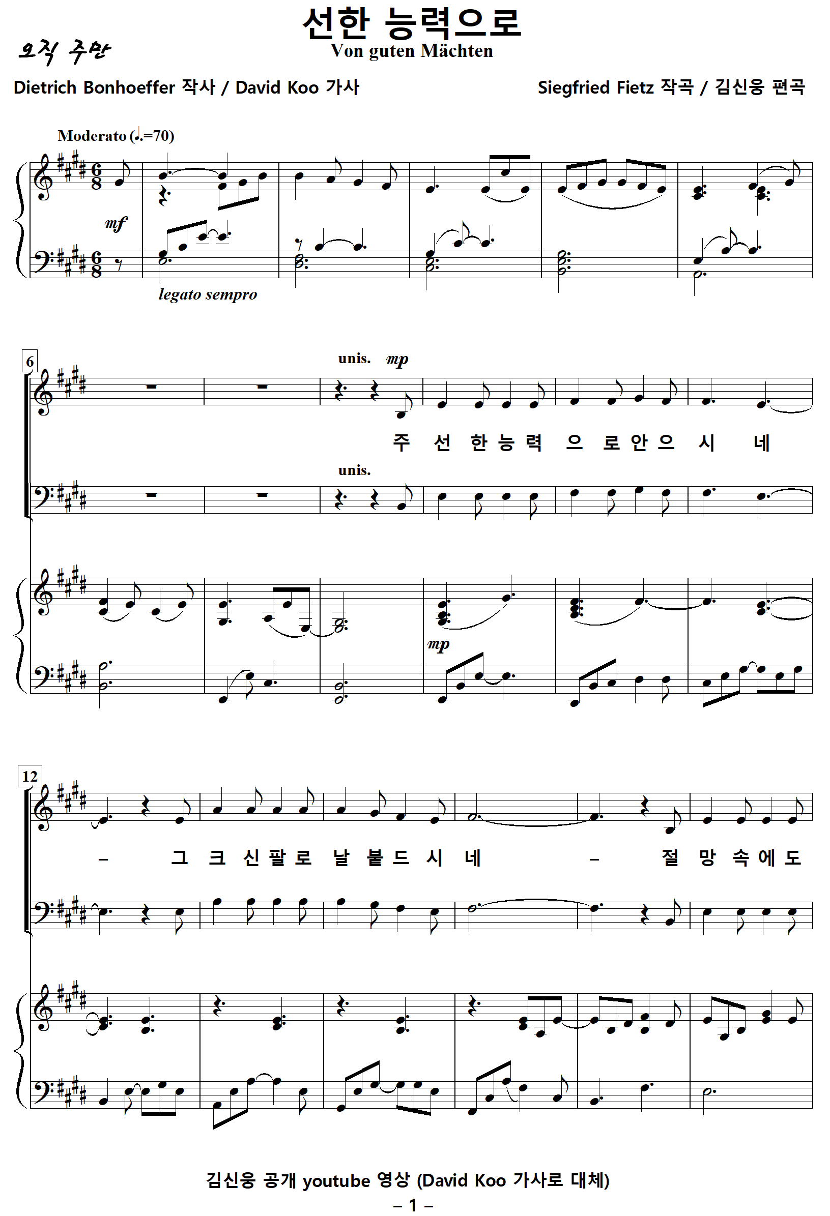 [찬양가사] 선한능력으로 / 주선한능력으로안으시네 [Dietrich Bonnhoffer 작사, Siegfried Fietz 작곡, 김신웅 편곡]