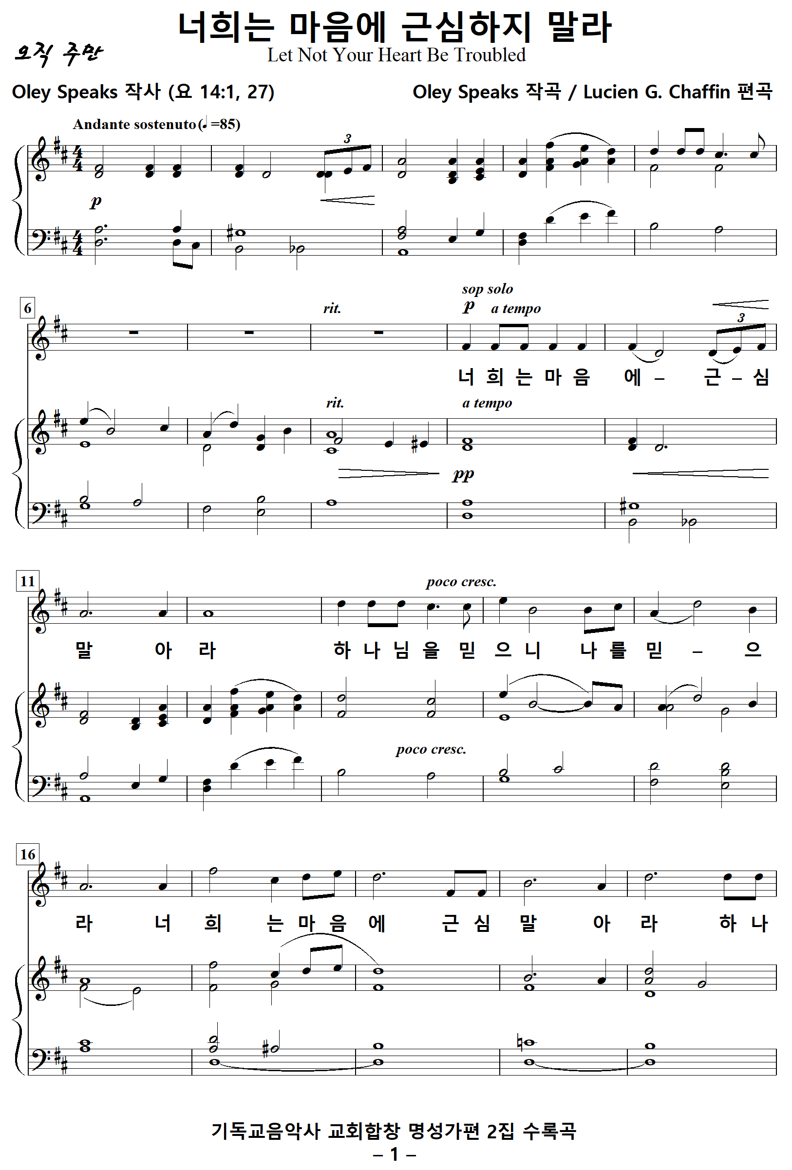 [찬양가사] 너희는마음에근심하지말라 / 너희는마음에근심말아라 [Oley Speaks 작사, Oley Speaks 작곡, Lucien G. Chaffin 편곡]
